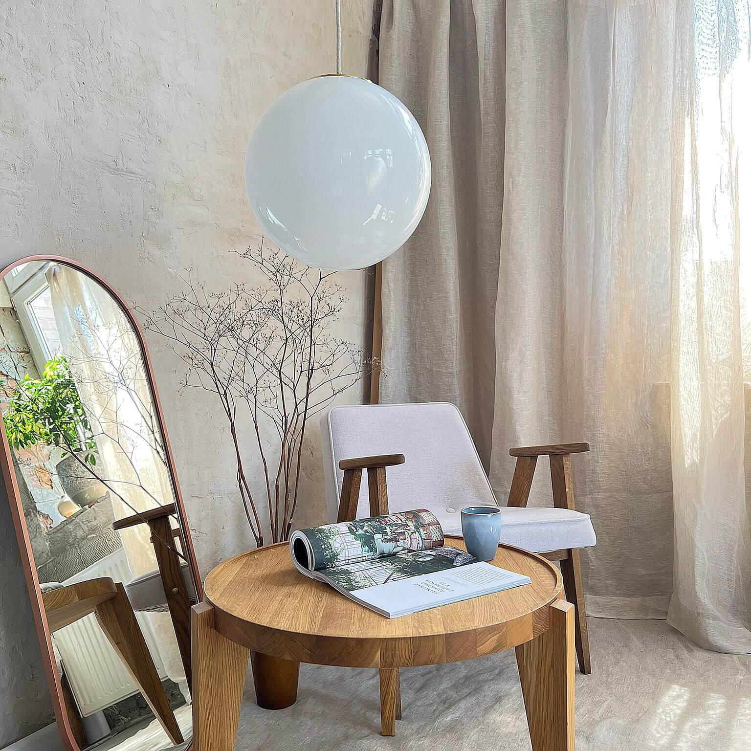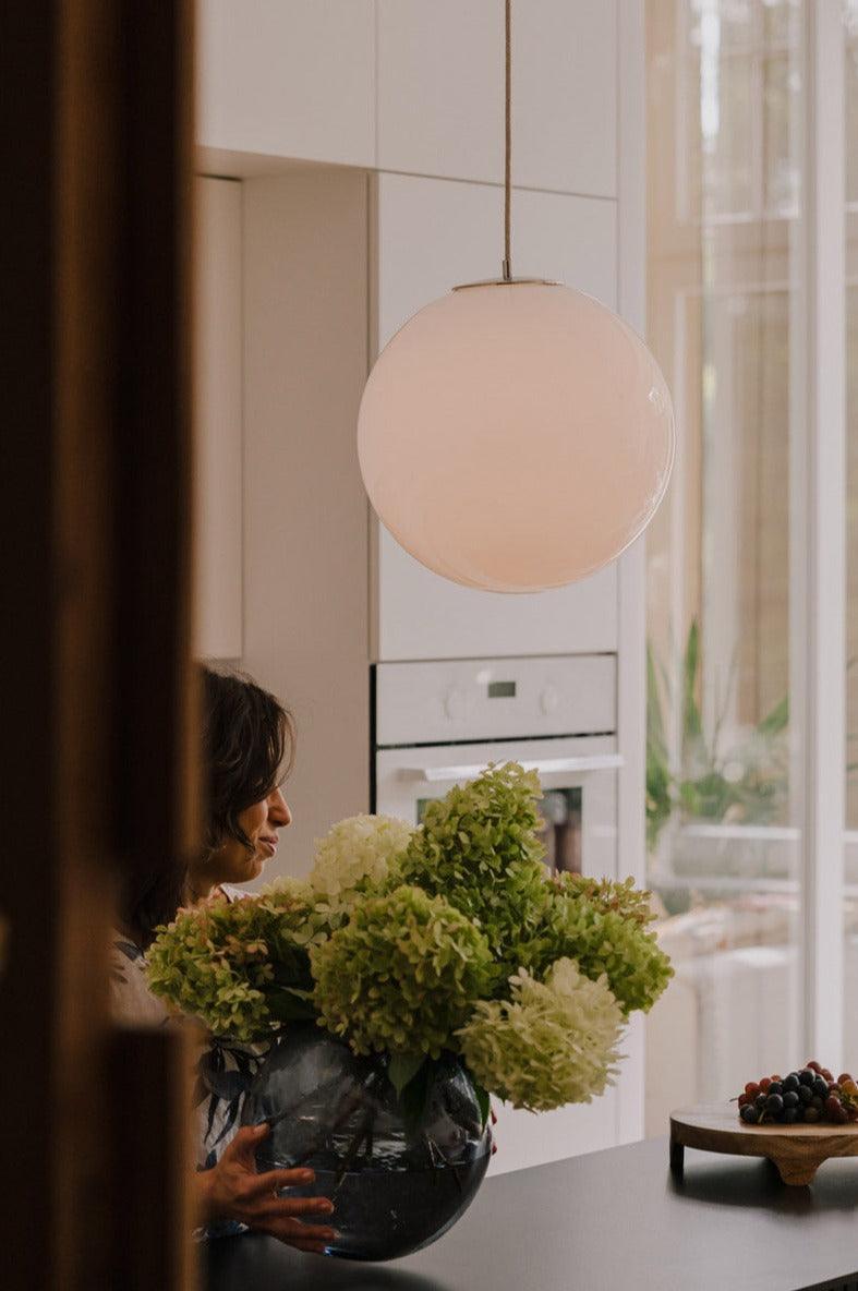 De Witte Bol is een hanglamp die altijd relevant zal blijven dankzij zijn tijdloze ontwerp en functionaliteit. De bol is vervaardigd uit drievoudig opaalglas in een handmatig productieproces door een lokale Poolse glasfabriek. Deze unieke combinatie van ambachtelijke traditie en modern design zorgt ervoor dat de Witte Bol een bijzondere, ongekende zachte gloed uitstraalt, waardoor de ruimte elegantie en een uniek karakter krijgt.