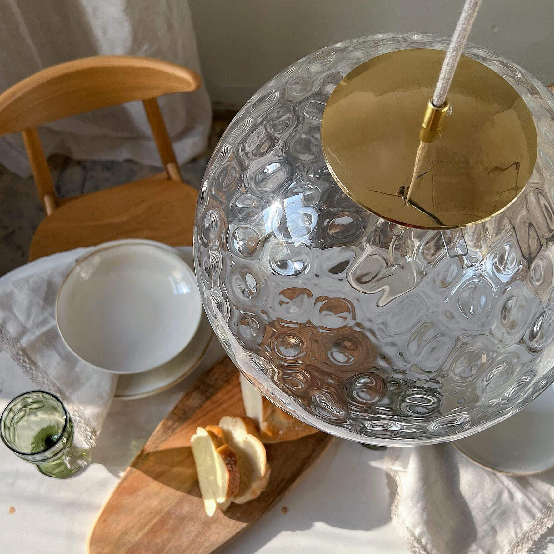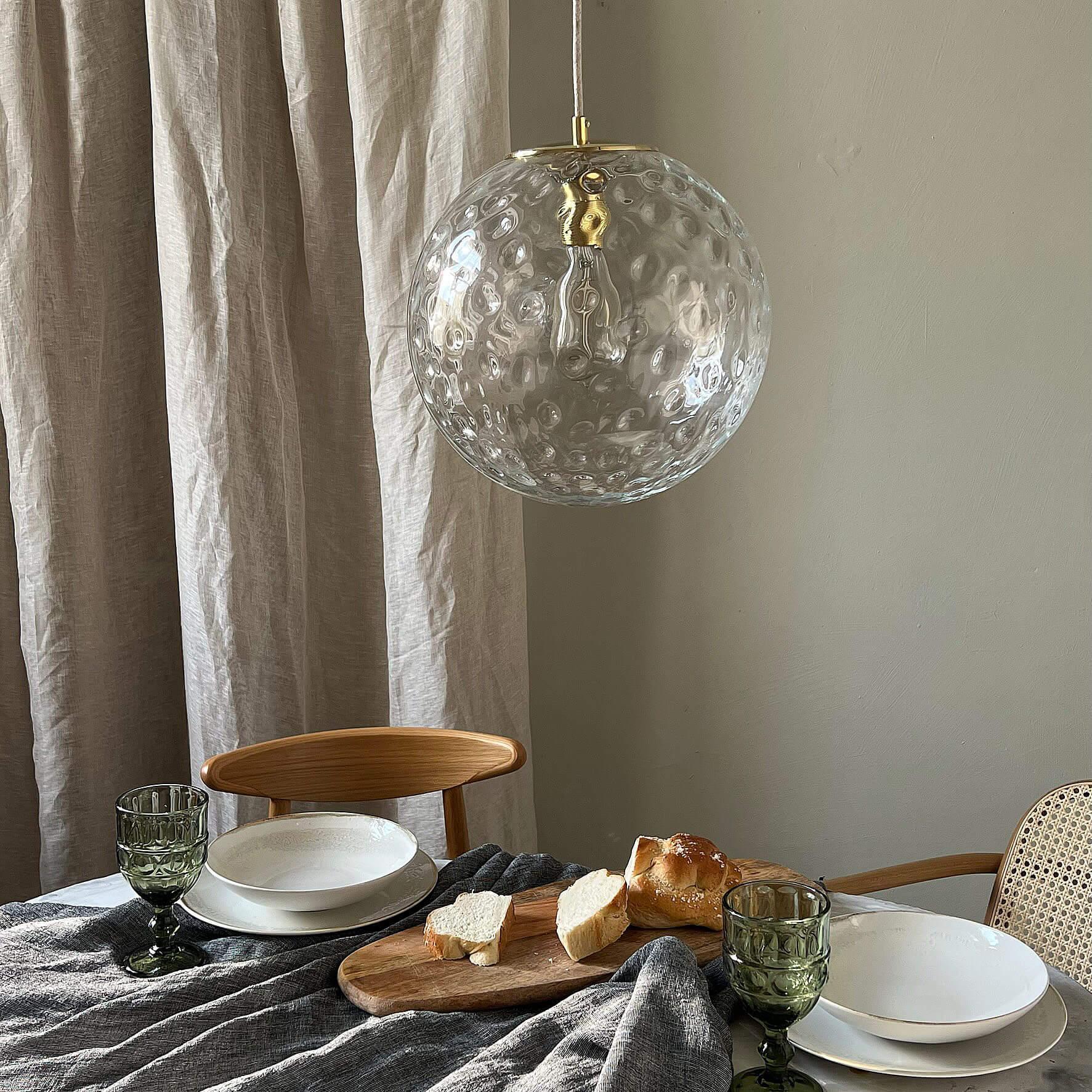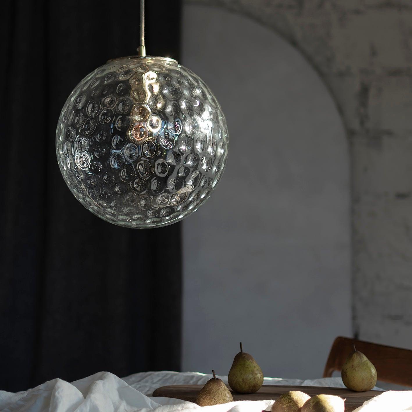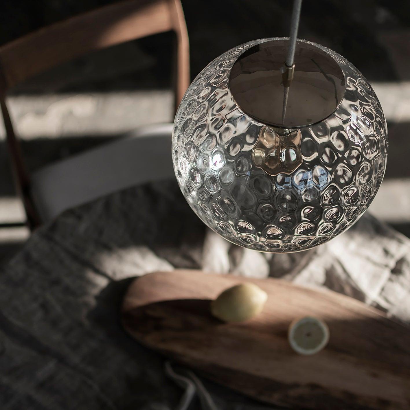 De lampenkap wordt op een unieke manier vervaardigd – getalenteerde, lokale ambachtslieden blazen elk stuk glas met de hand, nadat ze de bol hebben doorboord. Hierdoor ontstaan er kenmerkende verdikkingen aan de binnenzijde van de kap tijdens het blazen. Het mooiste aan de Reflecterende Bollen is dat er geen twee dezelfde lampen zijn! Ze zijn uniek, omdat er telkens een ander patroon op het glas ontstaat. Alles wordt bekroond met een deksel van massief, natuurlijk messing, dat na verloop van tijd een charmante patina zal ontwikkelen.