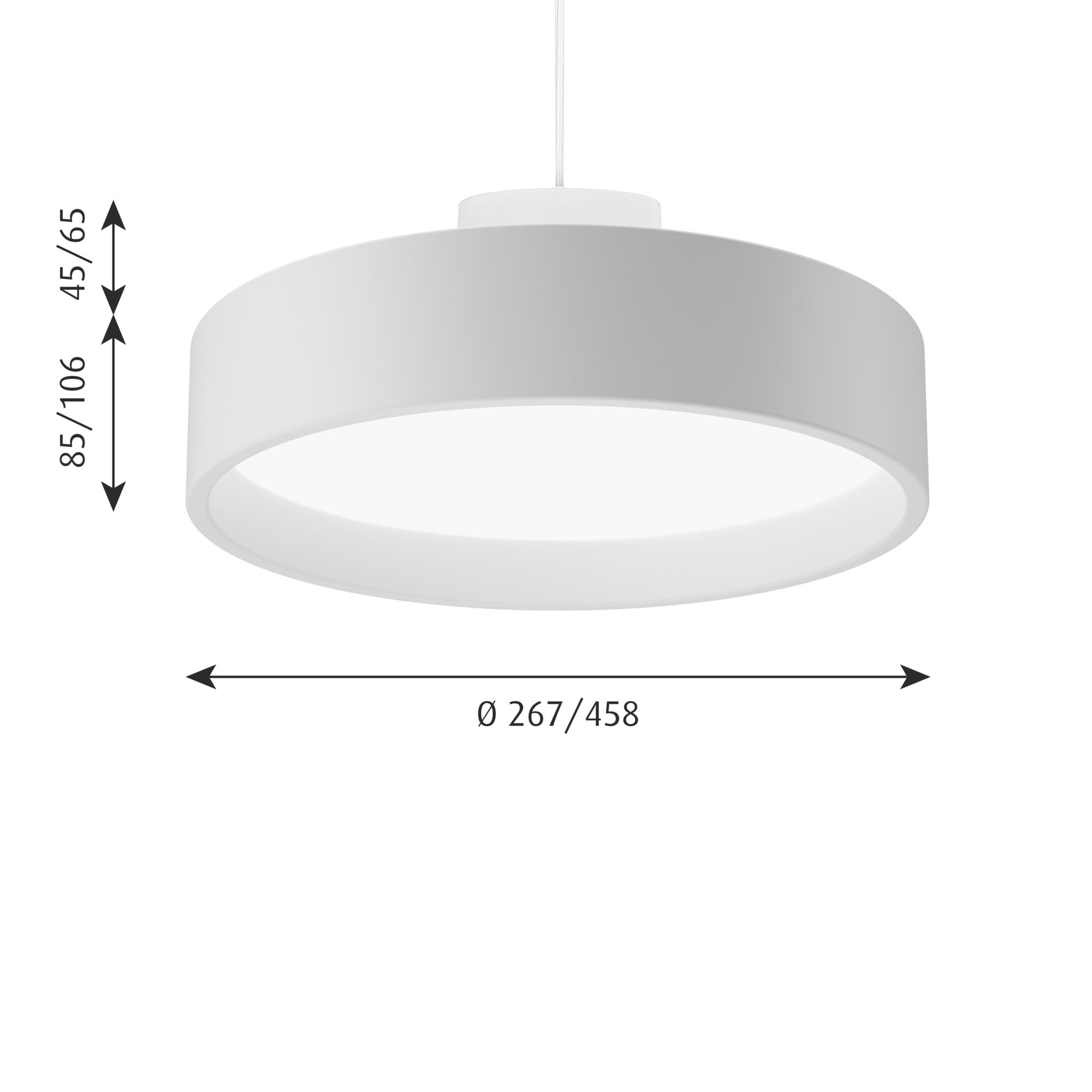 Lampa wisząca LP Circle to nowoczesna oprawa oświetleniowa zaprojektowana przez duńskie studio KHR Arkitekter. Jej forma inspirowana jest projektem Ørestad School OreLED i została stworzona z myślą o tym, by subtelnie współgrać z architekturą wnętrza. Charakterystyczny, zaokrąglony pierścień nadaje oprawie wyjątkowy charakter, a delikatny kąt nachylenia wewnętrznej krawędzi (5°) sprawia, że lampa emituje miękkie, rozproszone światło z dekoracyjnym efektem przejścia tonalnego.