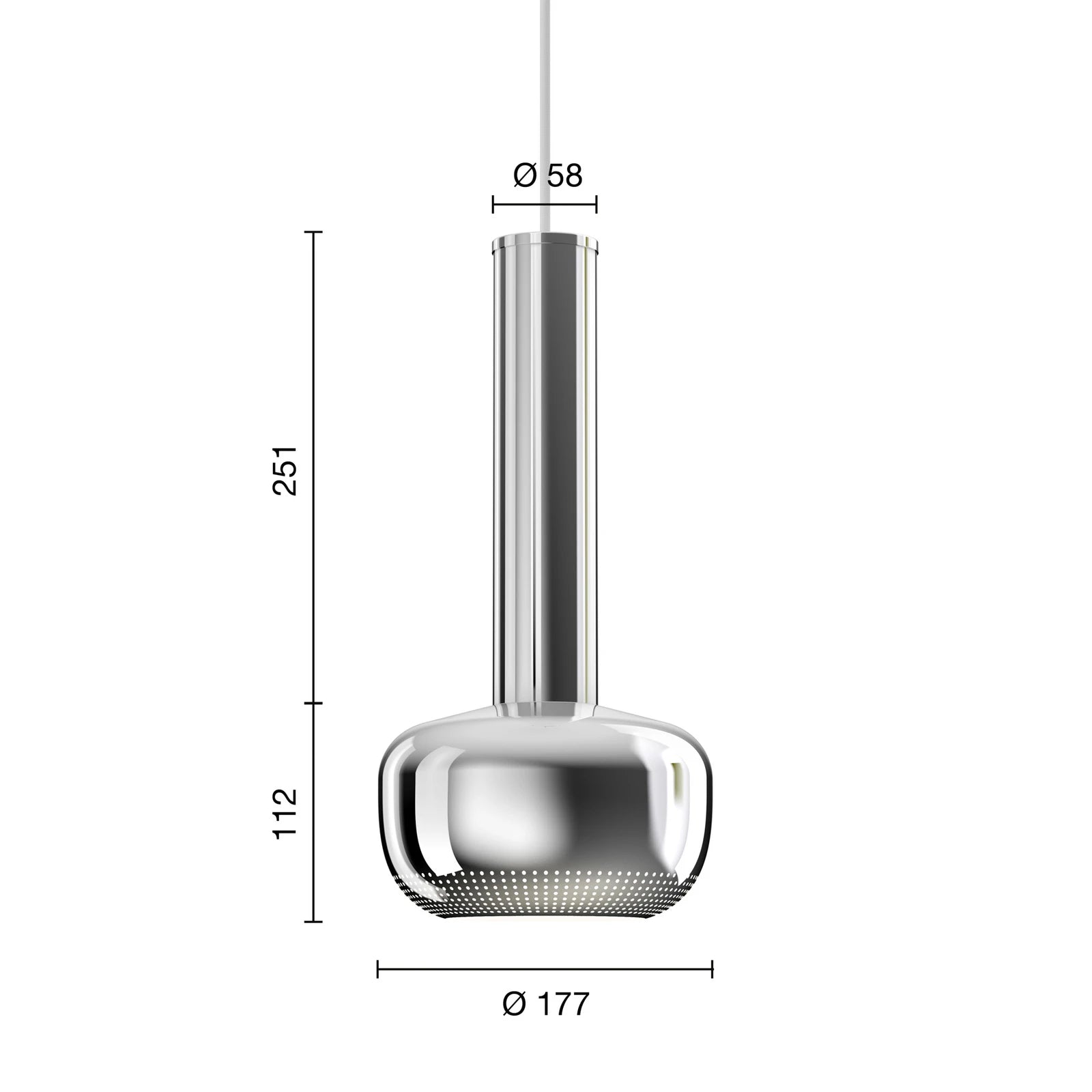 De lamp straalt licht naar beneden uit, volledig vrij van verblinding. Het kenmerkende geperforeerde patroon rond de onderste opening creëert een zachte overgang tussen licht en schaduw, evenals een decoratief lichteffect op het oppervlak van de kap en de omgeving.