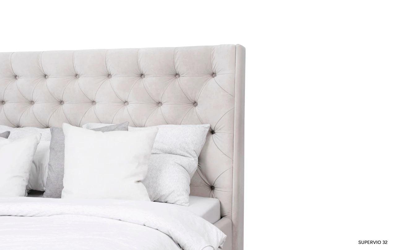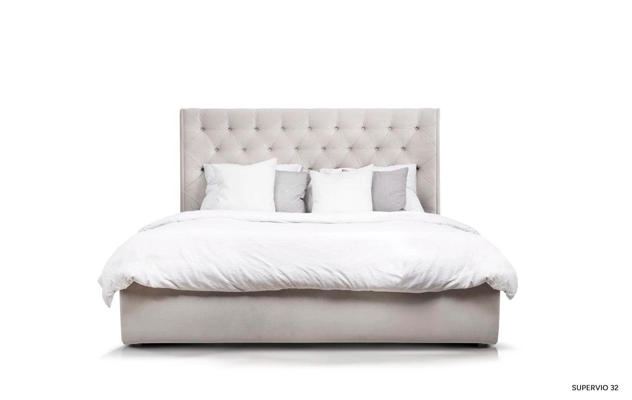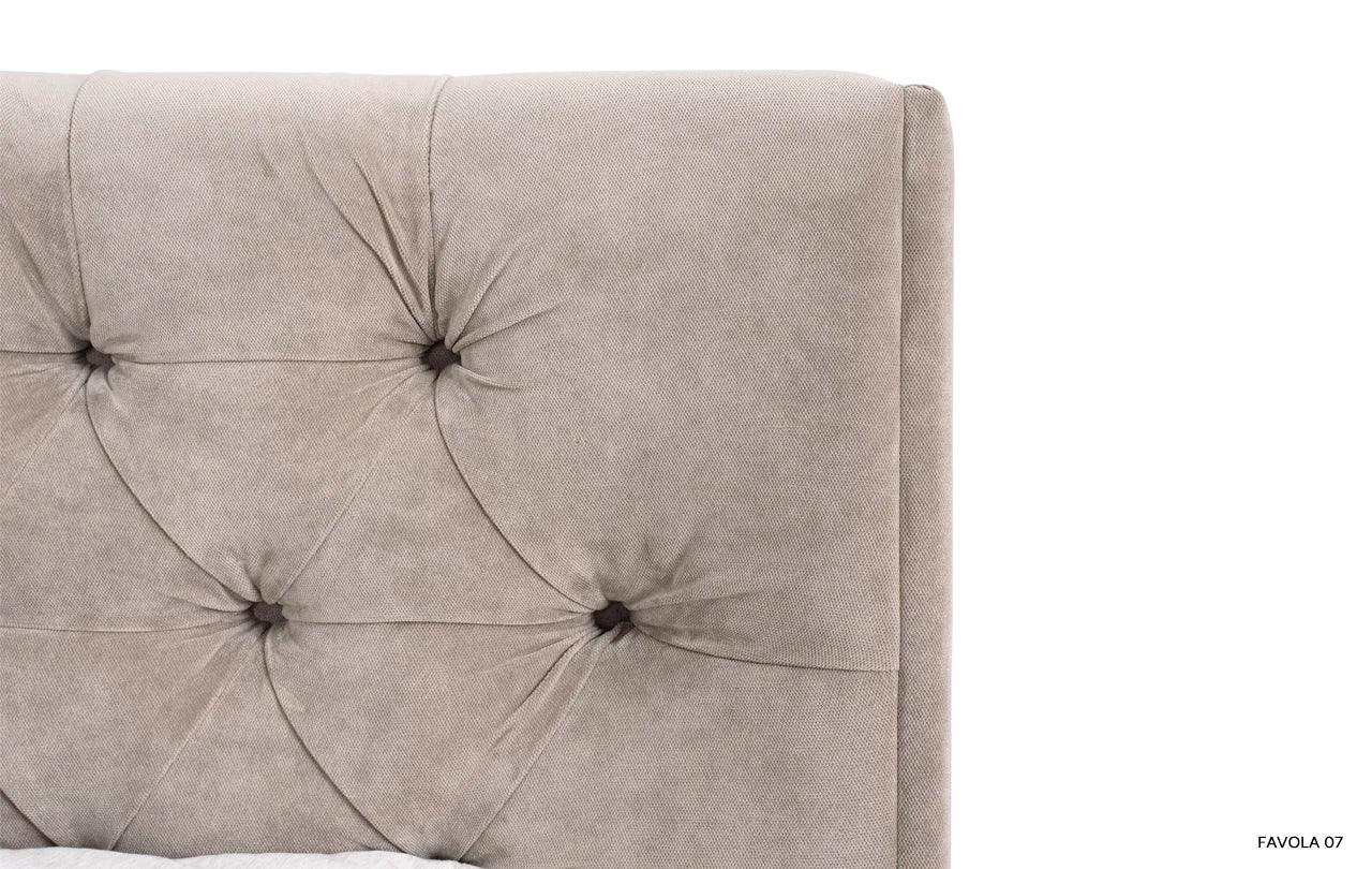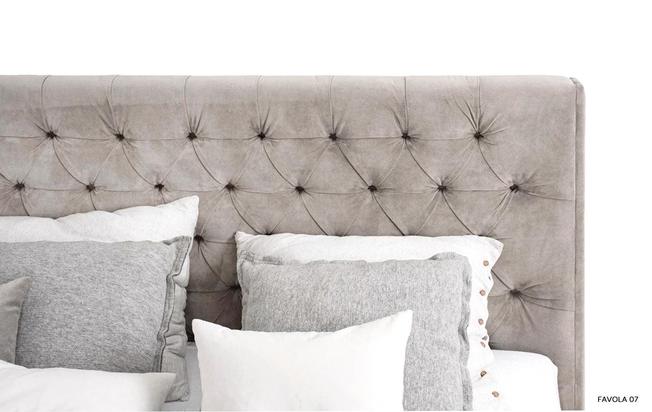 Kenmerkend voor het grijze bed Neiva is de extra stoffering, die het een unieke decoratieve uitstraling geeft. De zijpanelen die aan het hoofdeinde zijn bevestigd, zijn een elegante en stijlvolle toevoeging die het bed een unieke charme en karakter verleent.