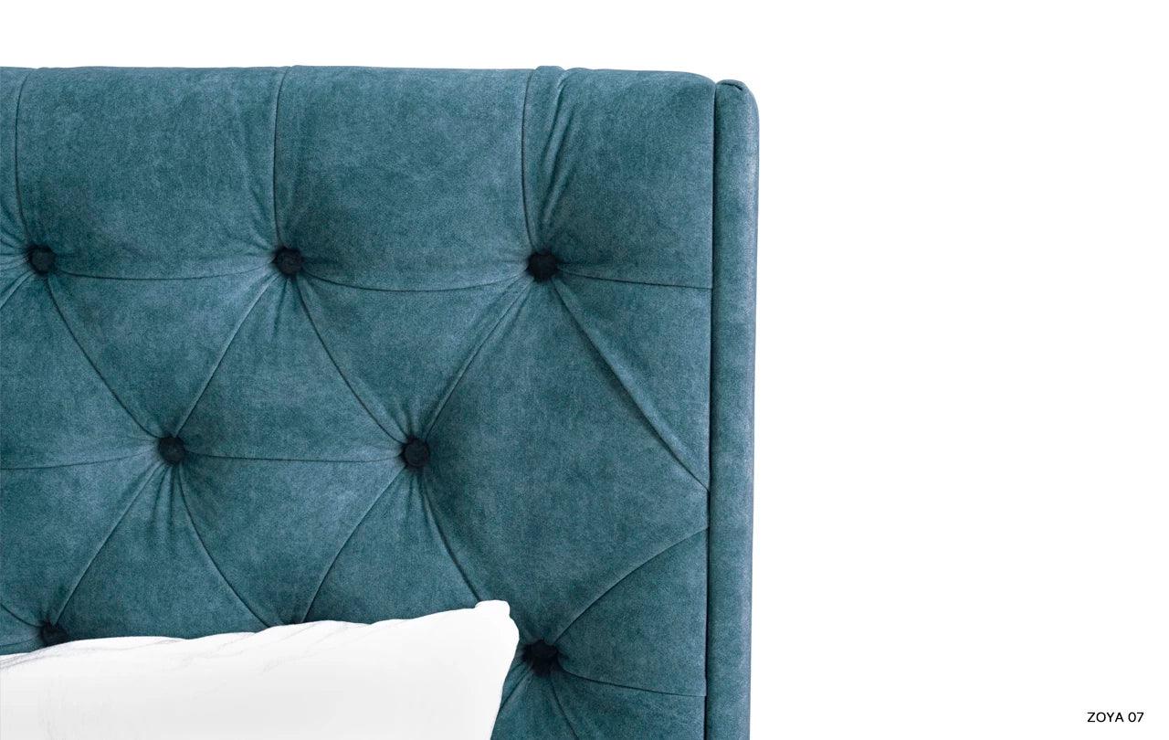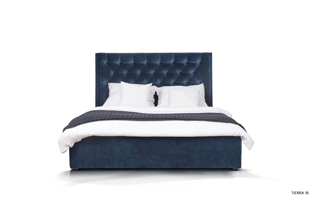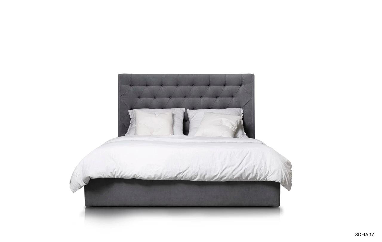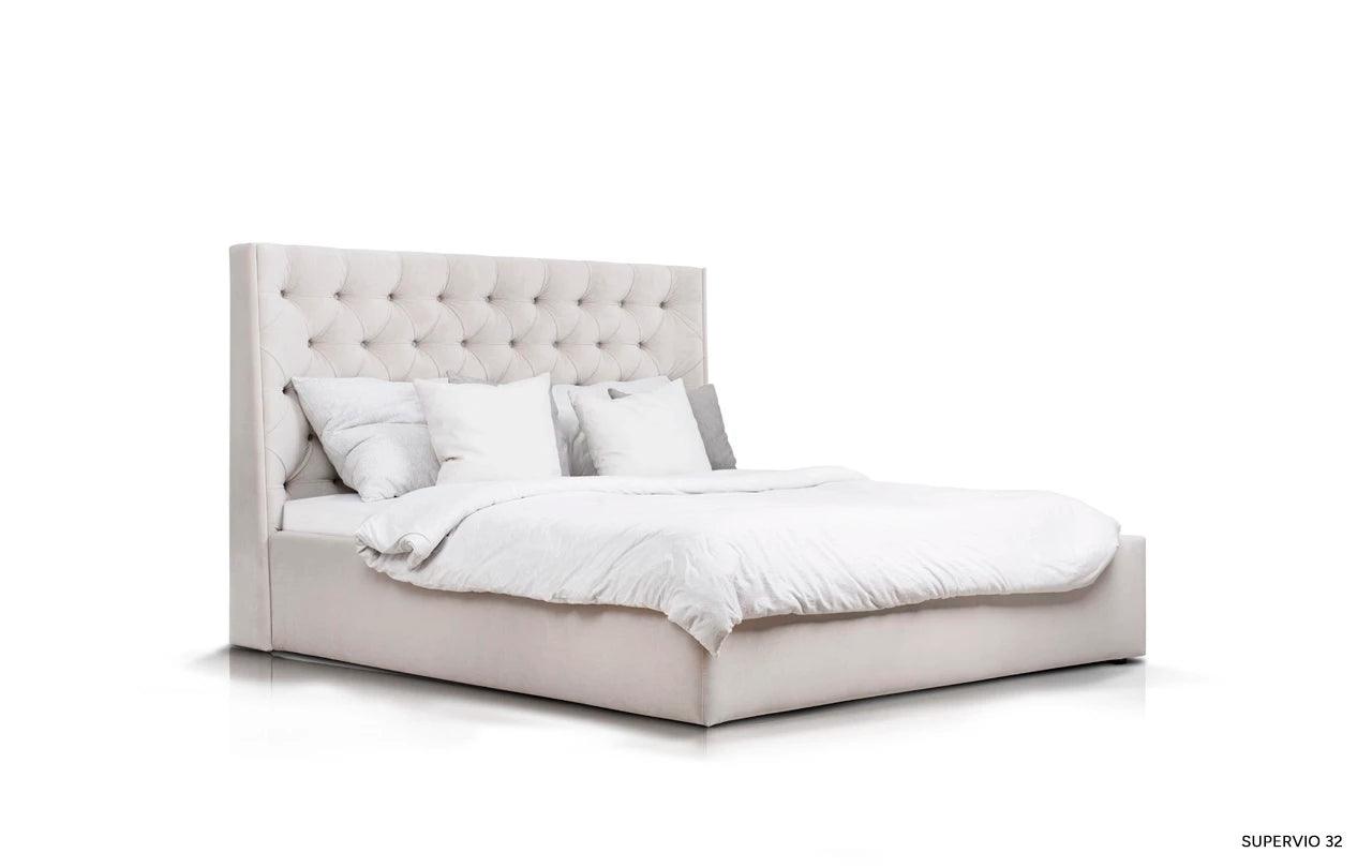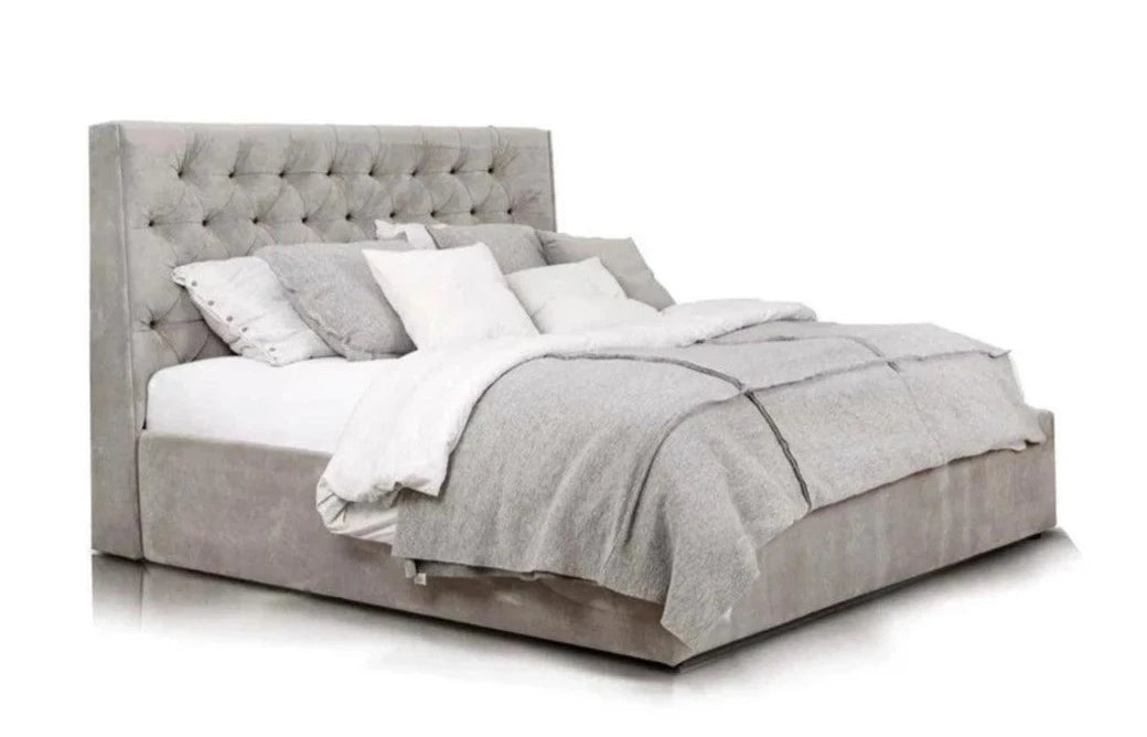 Kenmerkend voor het grijze bed Neiva is de extra stoffering, die het een unieke decoratieve uitstraling geeft. De zijpanelen die aan het hoofdeinde zijn bevestigd, zijn een elegante en stijlvolle toevoeging die het bed een unieke charme en karakter verleent.