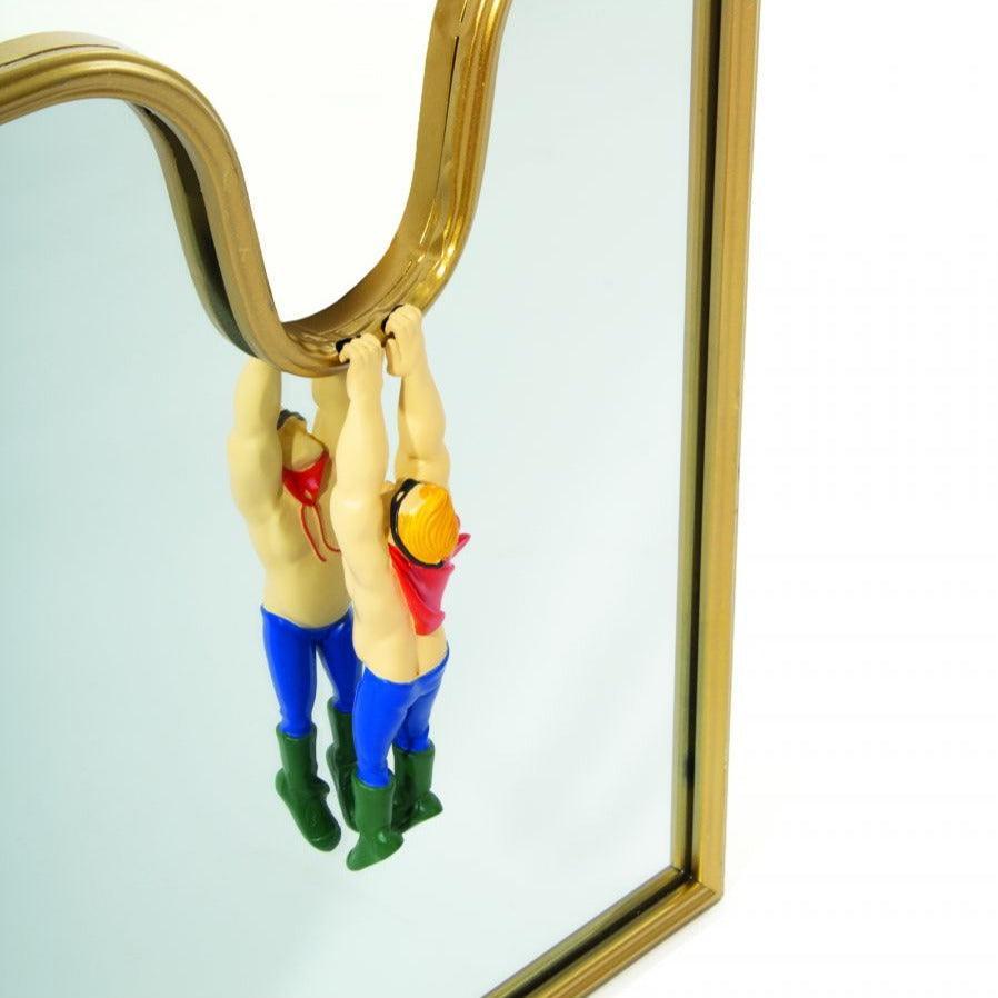 De gouden lijst geeft een opvallende glans, en de illusie van de figuur die lijkt los te komen van de achtergrond, voegt een ongebruikelijk karakter toe. Het is niet zomaar een spiegel, het is een kunstwerk dat inspireert om na te denken over wat echt is en wat illusie.