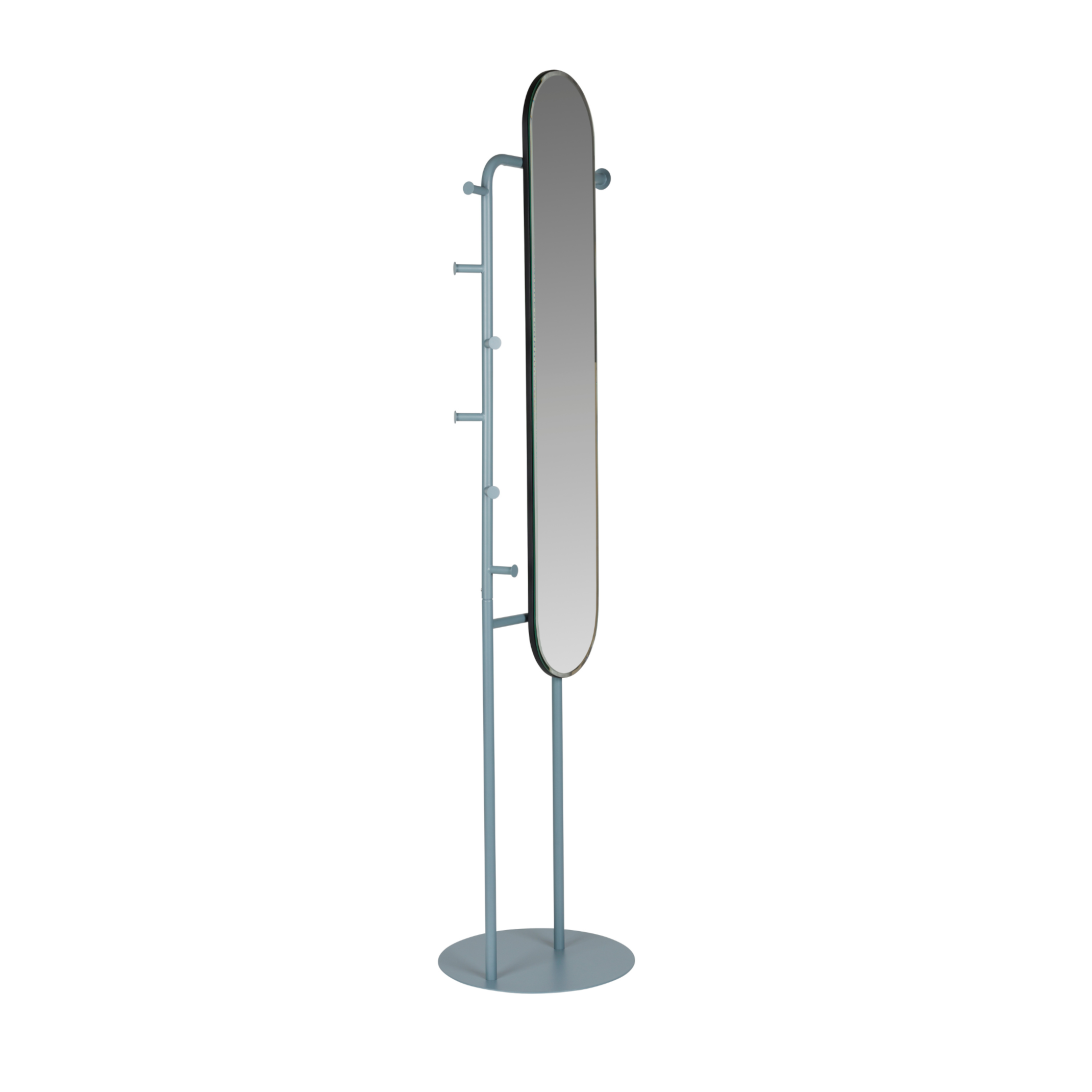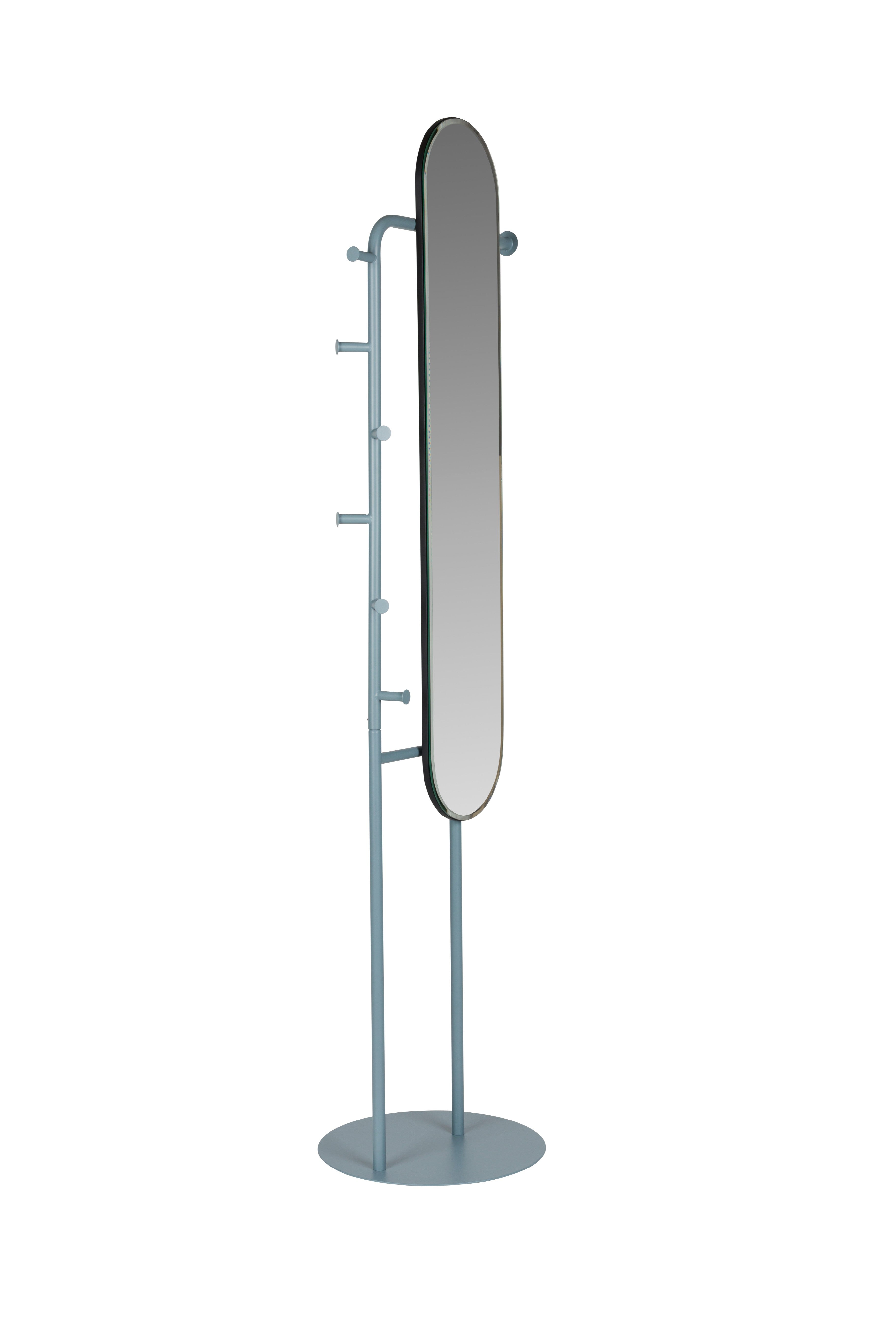 Staande spiegel Vero is een unieke aanvulling die functionaliteit perfect combineert met modern design. Het valt op door de afgeronde vorm van de spiegel, die is geplaatst op een stevig stalen frame dat poedergecoat is. De geometrische lijnen van de constructie en de zacht afgewerkte randen creëren een esthetisch geheel dat zowel in een moderne hal als in een elegante slaapkamer tot zijn recht komt. De ingebouwde haakjes aan de zijkanten bieden een praktische oplossing voor het ophangen van kleding, tassen of accessoires.