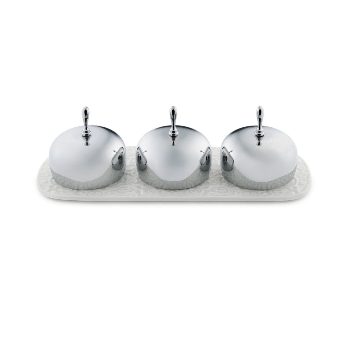 Jamkommen gemaakt van porselein en roestvrij staal is een elegante aanvulling op de ontbijttafel. Hun ontwerp, ontworpen door Marcel Wanders, combineert functionaliteit met esthetiek en biedt een eenvoudige, maar subtiel versierde vorm. Elke kom heeft een stalen deksel dat verfijning toevoegt en helpt de inhoud vers te houden. Het decoratieve dienblad met ruimte voor drie kommen geeft het geheel een harmonieuze uitstraling, perfect voor elegante ontbijten en feesten.