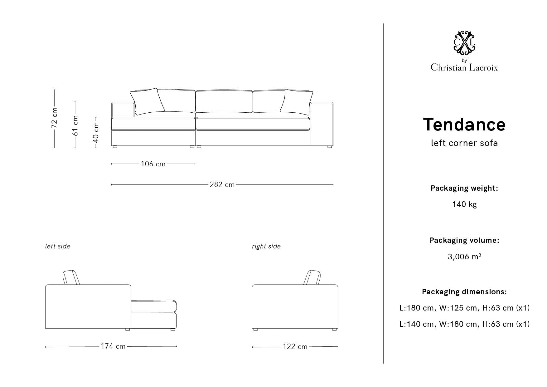 De elegante fluwelen stof heeft een gladde oppervlakte en voelt zeer aangenaam aan. Het materiaal is dik, stevig en tegelijkertijd zeer elegant en slijtvast. De hoekbank Tendance is perfect voor een ruime woonkamer, een stijlvolle slaapkamer of een moderne klassieke woonkamer, waar het comfort voor het hele gezin biedt.
