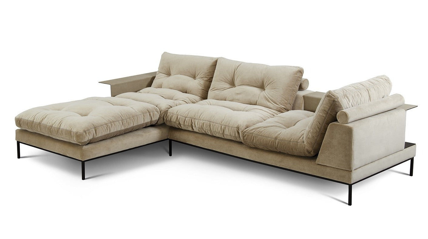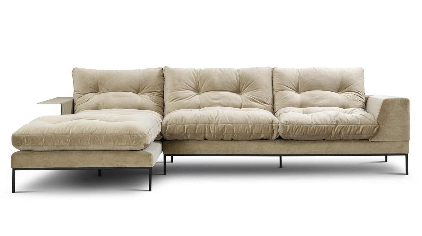 Charakterystycznym elementem narożnika Study są długie, miękkie poduchy, które pełnią rolę zarówno siedziska, jak i oparcia. Dodatkowo ozdobione są delikatnymi pikowaniami i guzikami, które nadają elegancji meblowi. Komfort użytkowania zapewniają włókna silikonowe wypełniające poduszki oraz specjalne wałki umieszczone za oparciem wspierające kręgosłup.