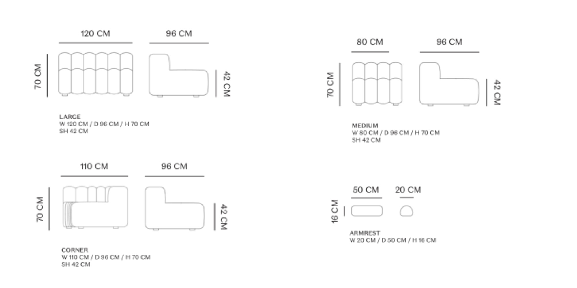 Studio kenmerkt zich door gedurfde, geribbelde bekleding geïnspireerd op de stijlen hoekbanken uit het einde van de jaren '70, op een verfijnde hedendaagse manier, wat de serie een unieke identiteit geeft. Elk Studio-module heeft zachte en vriendelijke lijnen, perfect voor leven, sociale bijeenkomsten en ontspanning, waar men zich volledig op zijn gemak kan voelen. De armleuningkussen is los en kan worden verschoven en veranderd in positie binnen de hele serie, wat een balans creëert met de geribbelde bekleding.