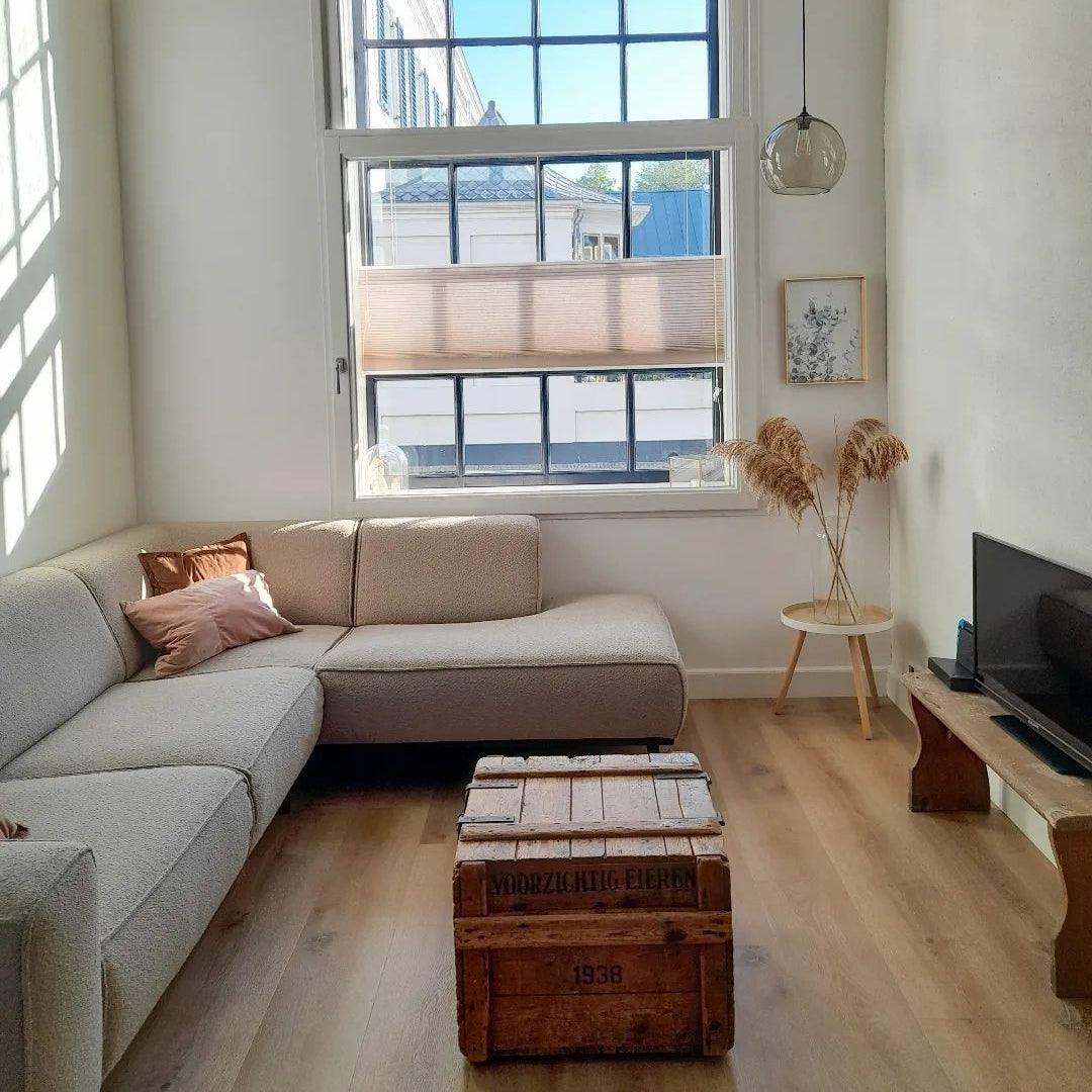 De hoekbank is ook beschikbaar in fluwelen, velours, corduroy, eco-leer en suède.