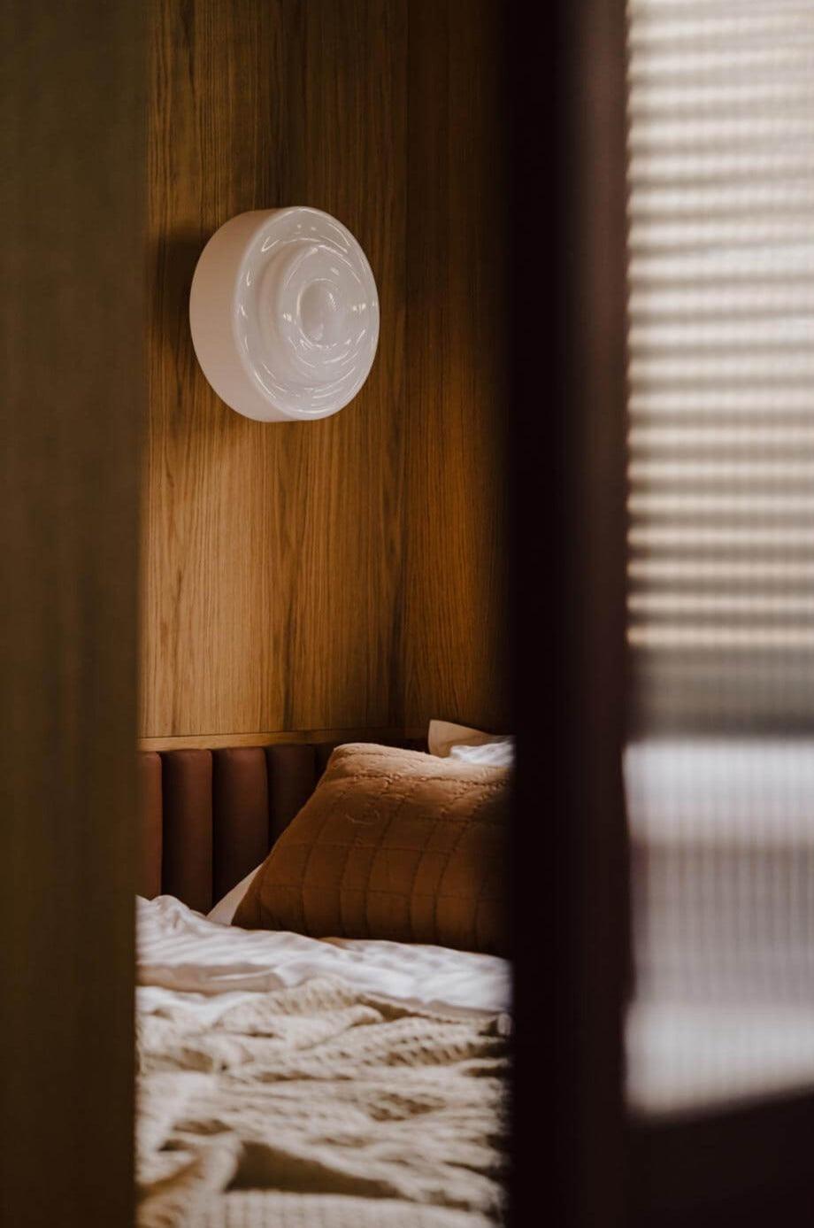 Het handmatige aspect van de productie zorgt ervoor dat elk plafond een unieke, individuele expressie krijgt. Mogelijke subtiele ongelijkheden in de verdeling van de glaslagen of de charmante platte luchtbellen zijn wat Mémoire zijn eigen ziel geeft. Nikkel lamp is geschikt voor zowel wandmontage – als wandlamp – als voor plafondmontage, in de rol van plafondlamp.