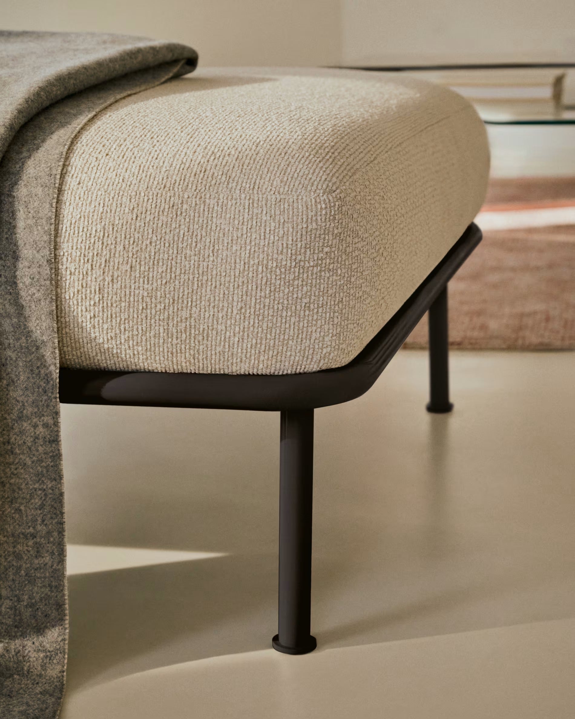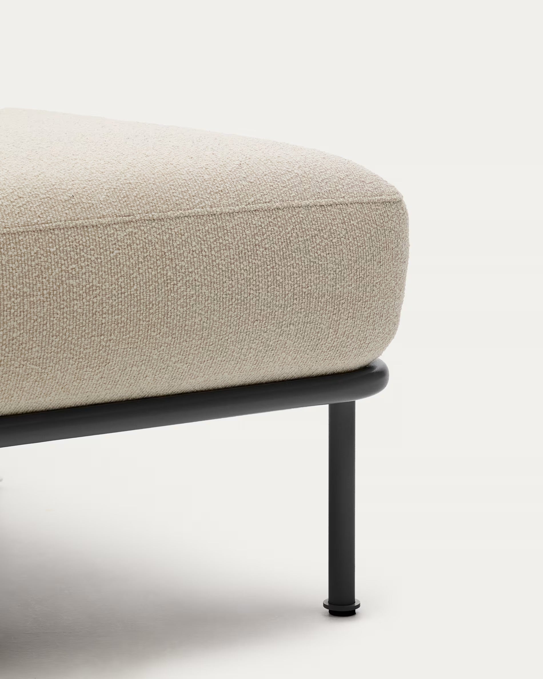 Voetenbank Aurum is een uitstekende aanvulling op een moderne ontspanningsruimte – ontworpen om comfort, esthetiek en functionaliteit te bieden in het dagelijks gebruik. Zijn minimalistische vorm en bekleding in ecru tint passen perfect bij de panoramische architectuur van de Aurum-collectie, waardoor een harmonieuze eenheid ontstaat. De basis van geschilderd metaal in donkergrijs voegt contrast en elegantie toe, terwijl het subtiel de vorm van het meubel boven de vloer verheft en zijn moderne karakter versterkt.