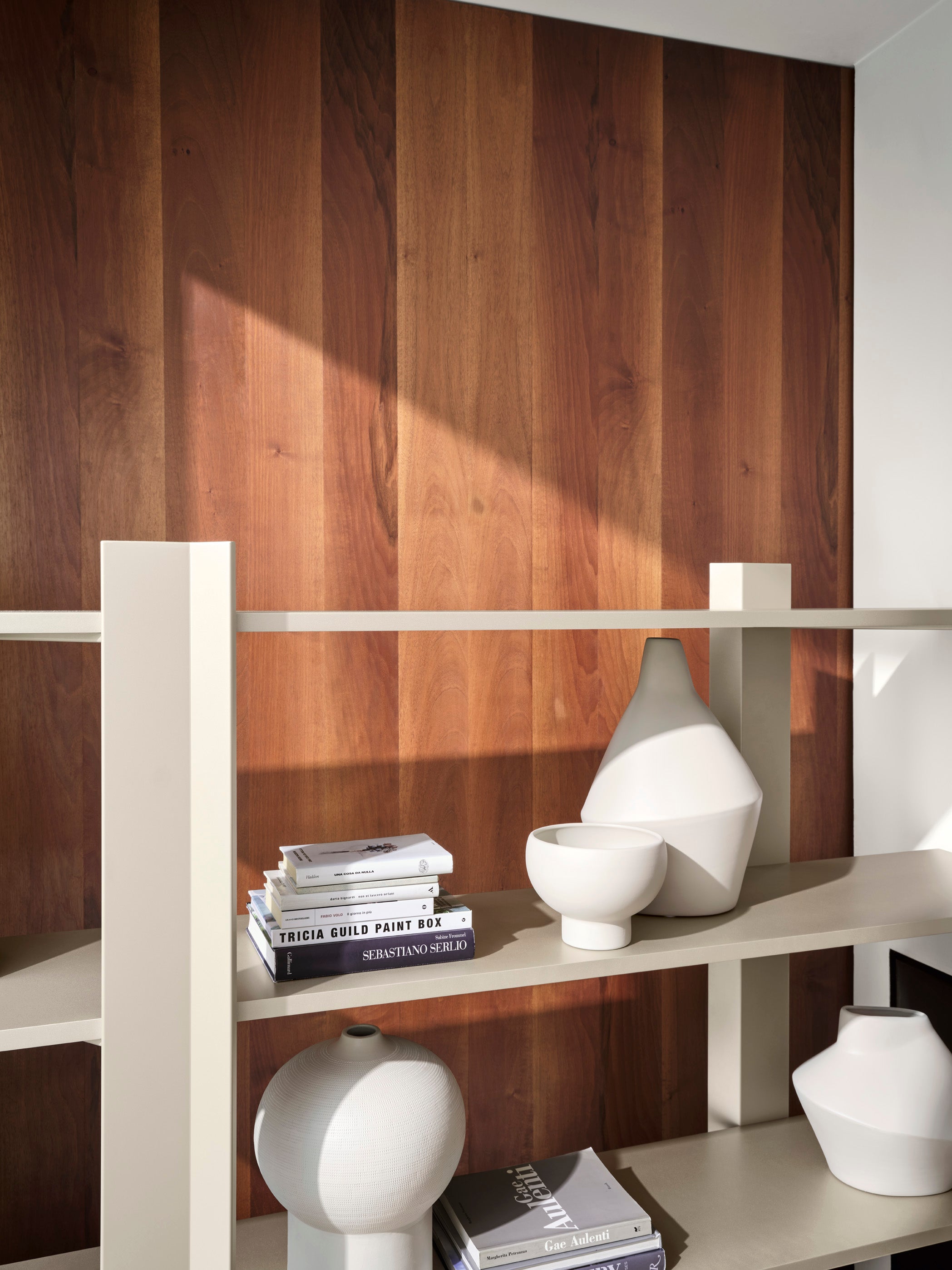 Boekenkast Wu is een vrijstaand meubel met veelzijdige toepassingen, dat zowel tegen de muur als in het midden van de ruimte kan worden geplaatst als een stijlvolle ruimteverdeler. De eenvoudige vorm is verrijkt met verfijnde details, zoals onregelmatig geplaatste V-vormige steunen, die het geheel een moderne en dynamische uitstraling geven.
