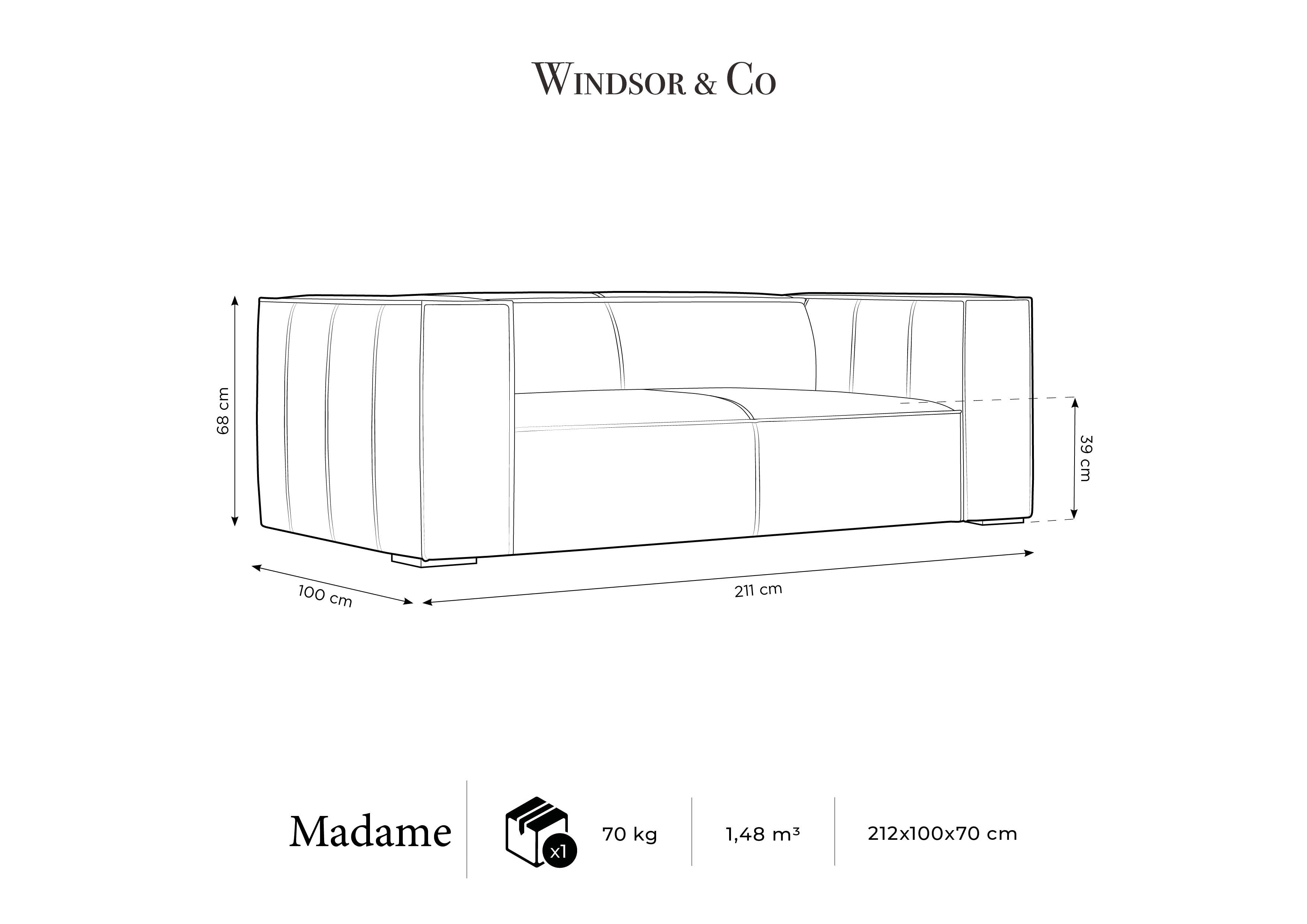 Sofa voor twee personen Madame met een uitgesproken karakter en elegante afwerking is de perfecte keuze voor een moderne woonkamer. De diepe zitting is zowel ideaal voor sociale bijeenkomsten als voor momenten van ontspanning na een lange dag. Het biedt de mogelijkheid om comfortabel te ontspannen in verschillende posities. Met een laag profiel, brede armleuningen en rugleuningen vormt het een gezellige vorm.