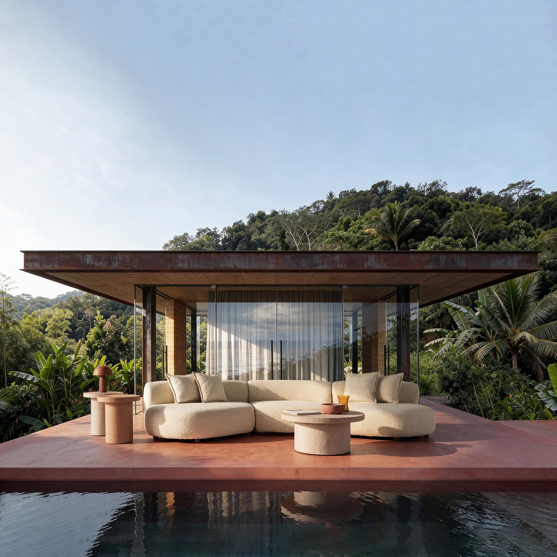 Buitenbank Wenden heeft een brede, zachte vorm die onmiddellijk een comfortabele ontspanningsruimte buiten creëert. De vorm is breed en open, waardoor het de ruimte goed organiseert en een plek biedt die bevorderlijk is voor ontspanning. Dit is een model dat moderne aanwezigheid combineert met een lichte, ongedwongen uitstraling.