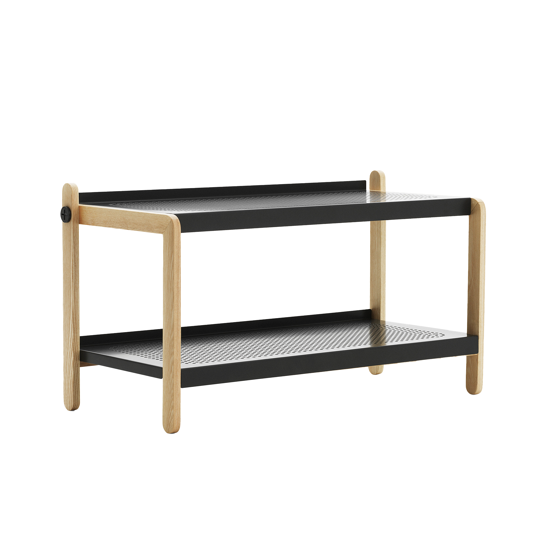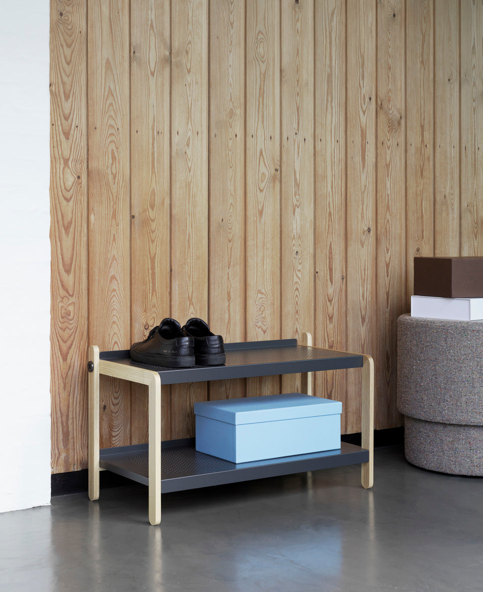 Sko is een schoenenrek met een industriële en tegelijkertijd eenvoudige uitstraling, vervaardigd uit stevige, Scandinavische materialen. Het is ontworpen zonder overbodige elementen en bestaat uit een houten frame en twee geperforeerde stalen planken, die zijn verbonden met opvallende schroeven.