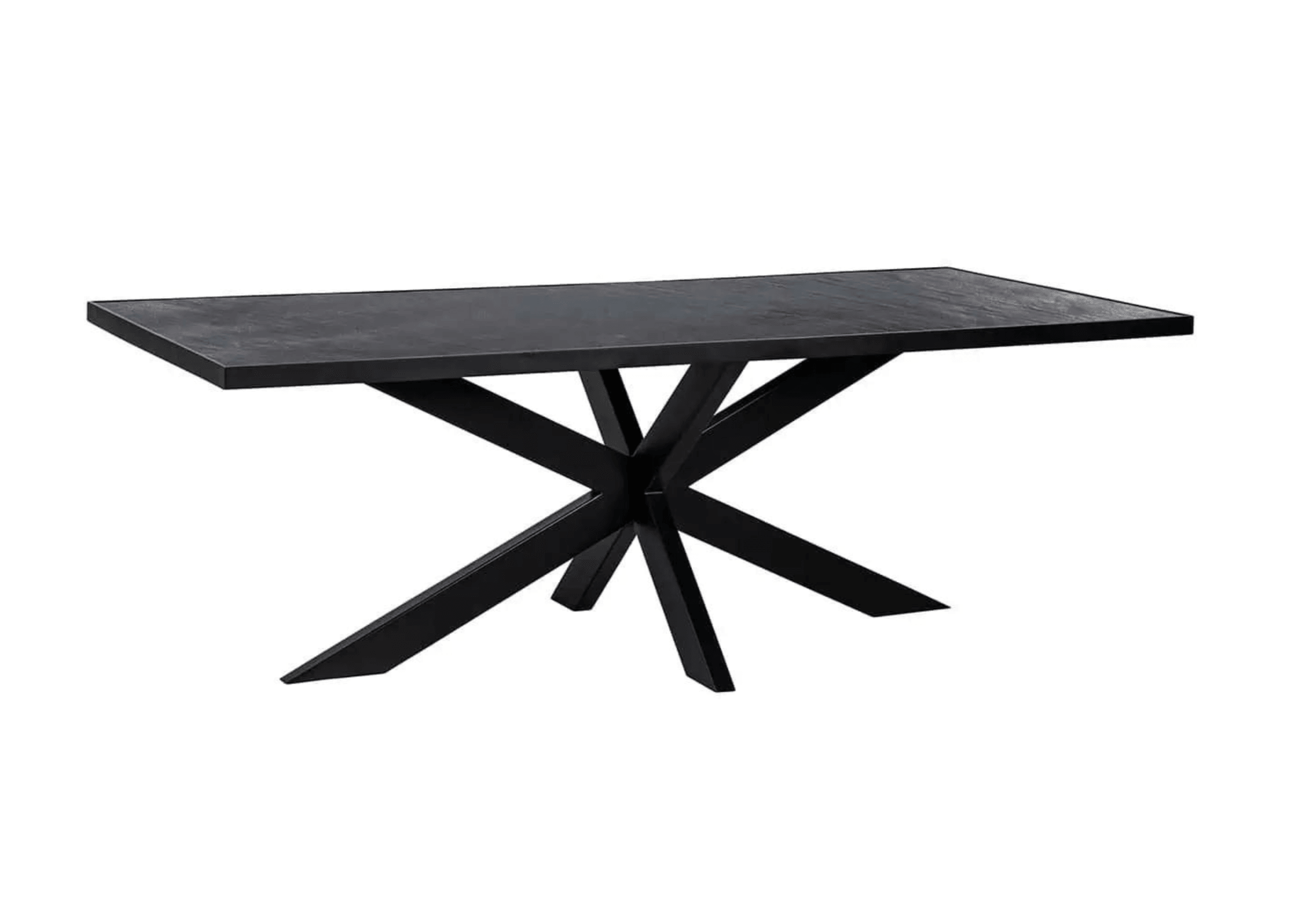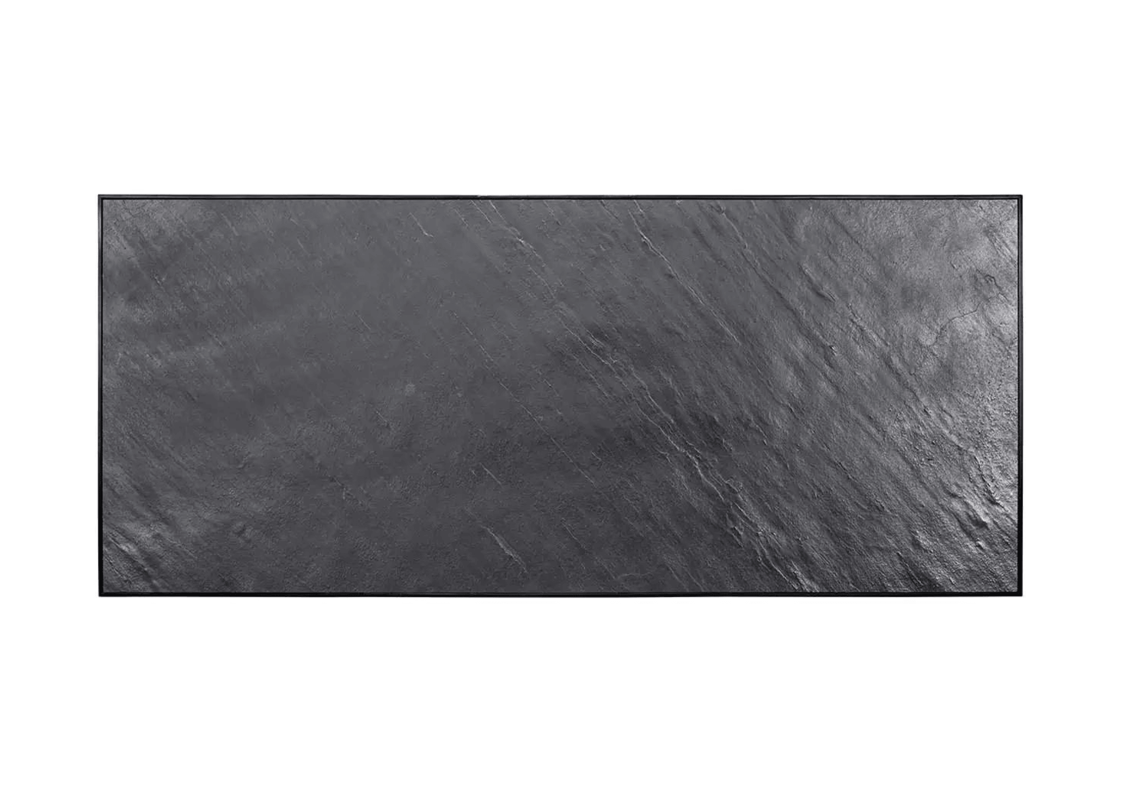 Tafel Bourbon in zwart is een unieke meubelstuk met een opvallend uiterlijk. De basis van ijzer, waar de poten elkaar kruisen, geeft het een licht industrieel karakter, wat het een bijzondere uitstraling en uniciteit verleent. Het tafelblad is gemaakt van stenen fineer dat op een ijzeren frame is bevestigd, wat het stevigheid en stijl geeft. Deze combinatie van materialen en design zorgt ervoor dat deze tafel een zekere rauwheid uitstraalt, terwijl het tegelijkertijd elegant blijft. Het is het ideale meubel voor degenen die de combinatie van industriële stijl met verfijnde esthetiek waarderen.