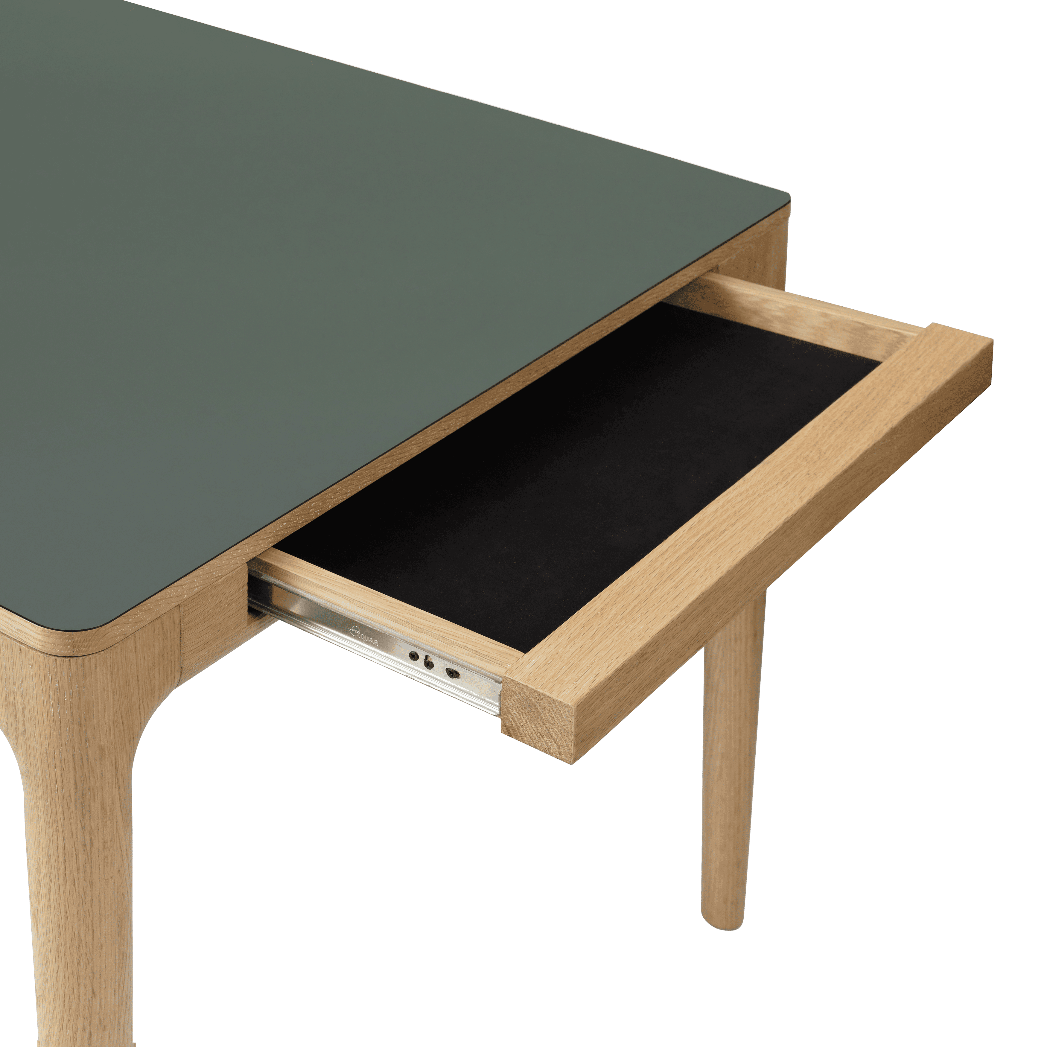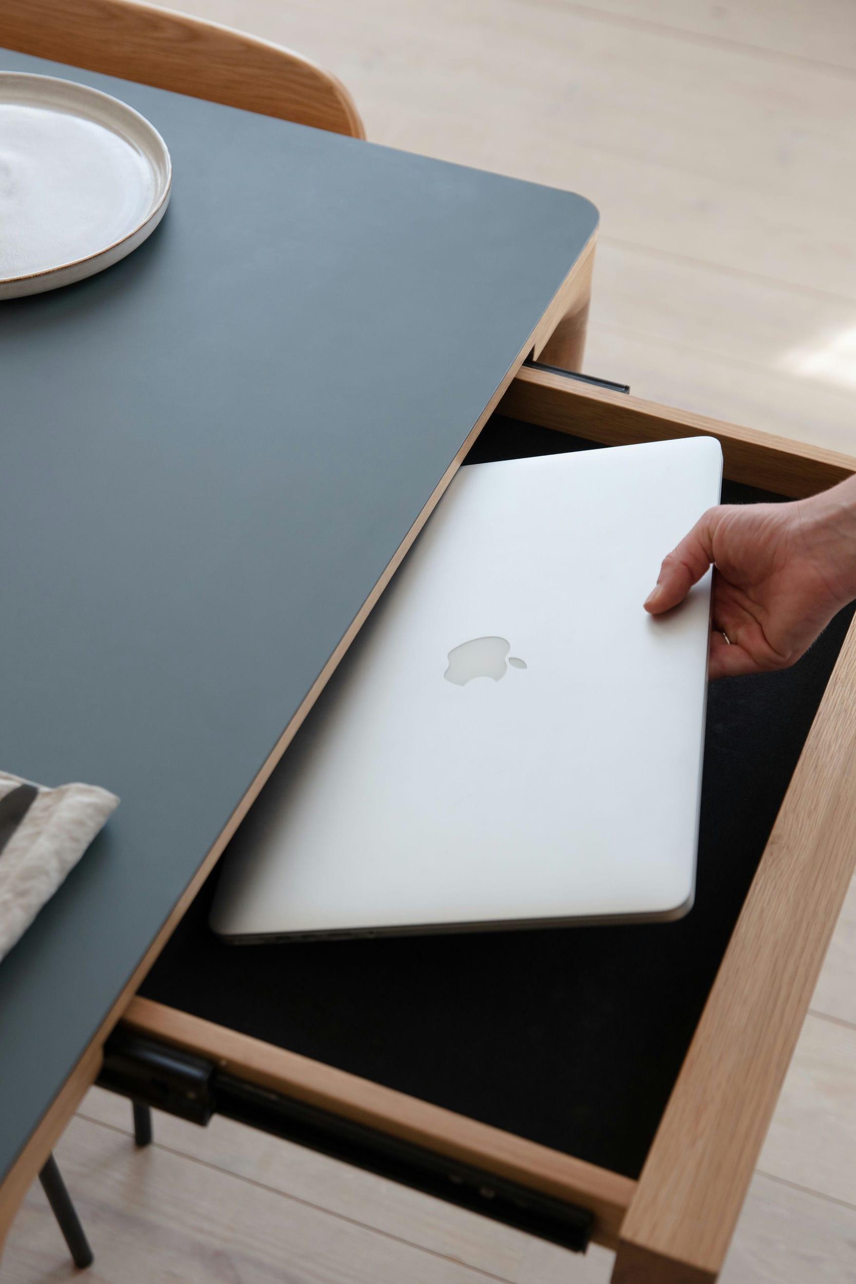 Beide uiteinden van de tafel verbergen twee lades, bekleed met een zachte stof, waarmee u snel rommel en sporen die het dagelijks leven soms achterlaat, kunt opbergen. Deze twee lades dienen ook als handgrepen voor de twee verlengplaten, waardoor de stabiliteit van de tafel gewaarborgd blijft, zelfs wanneer deze is uitgeschoven. De verlengplaten zijn discreet achter de tafel verborgen en kunnen eenvoudig worden toegevoegd of verwijderd, afhankelijk van uw behoeften.