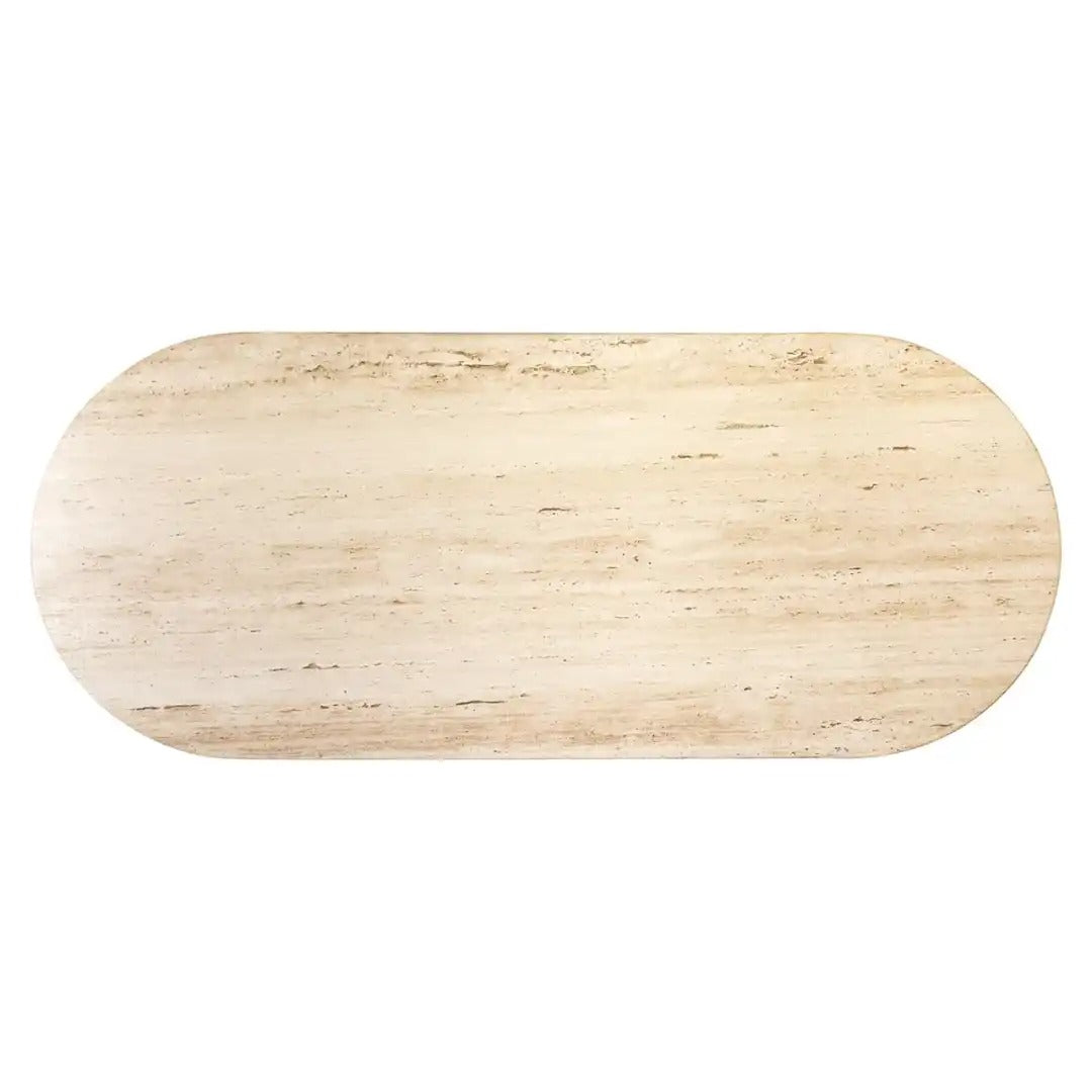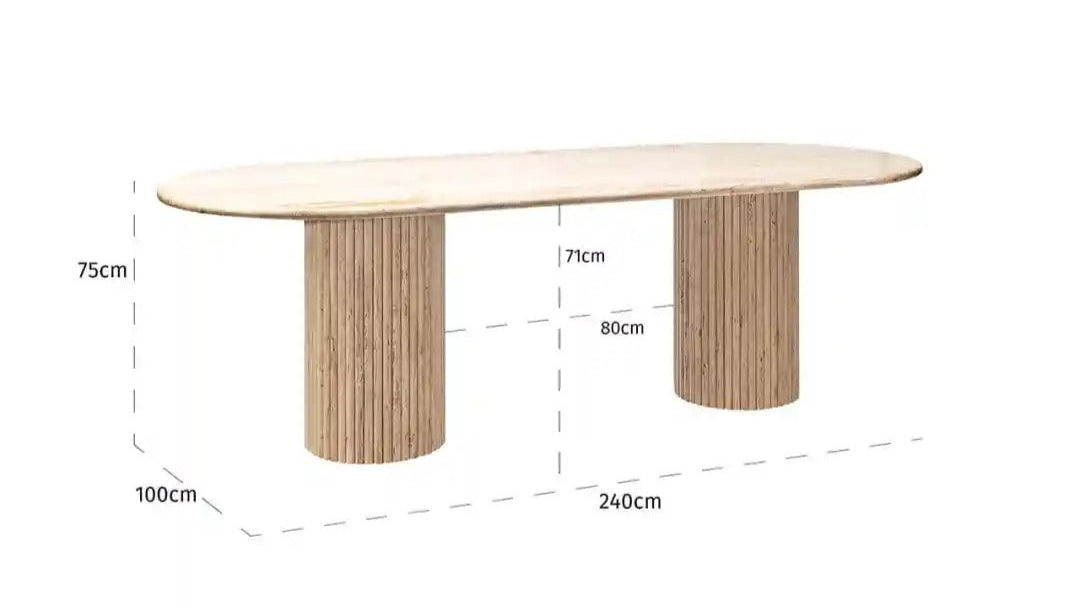 Elegante tafel La Cantera met een blad van travertin is een luxe meubelstuk met een unieke uitstraling, dat natuurlijke elegantie en verfijning in uw interieur brengt. Het ovale blad van 3 cm dik verrast met een uniek patroon van steen, terwijl de basis met geribbelde cilindrische poten een moderne lichtheid en decoratieve expressie toevoegt. Het travertin in een lichte tint past prachtig bij neutrale arrangementen en brengt een subtiele glans in de ruimte.