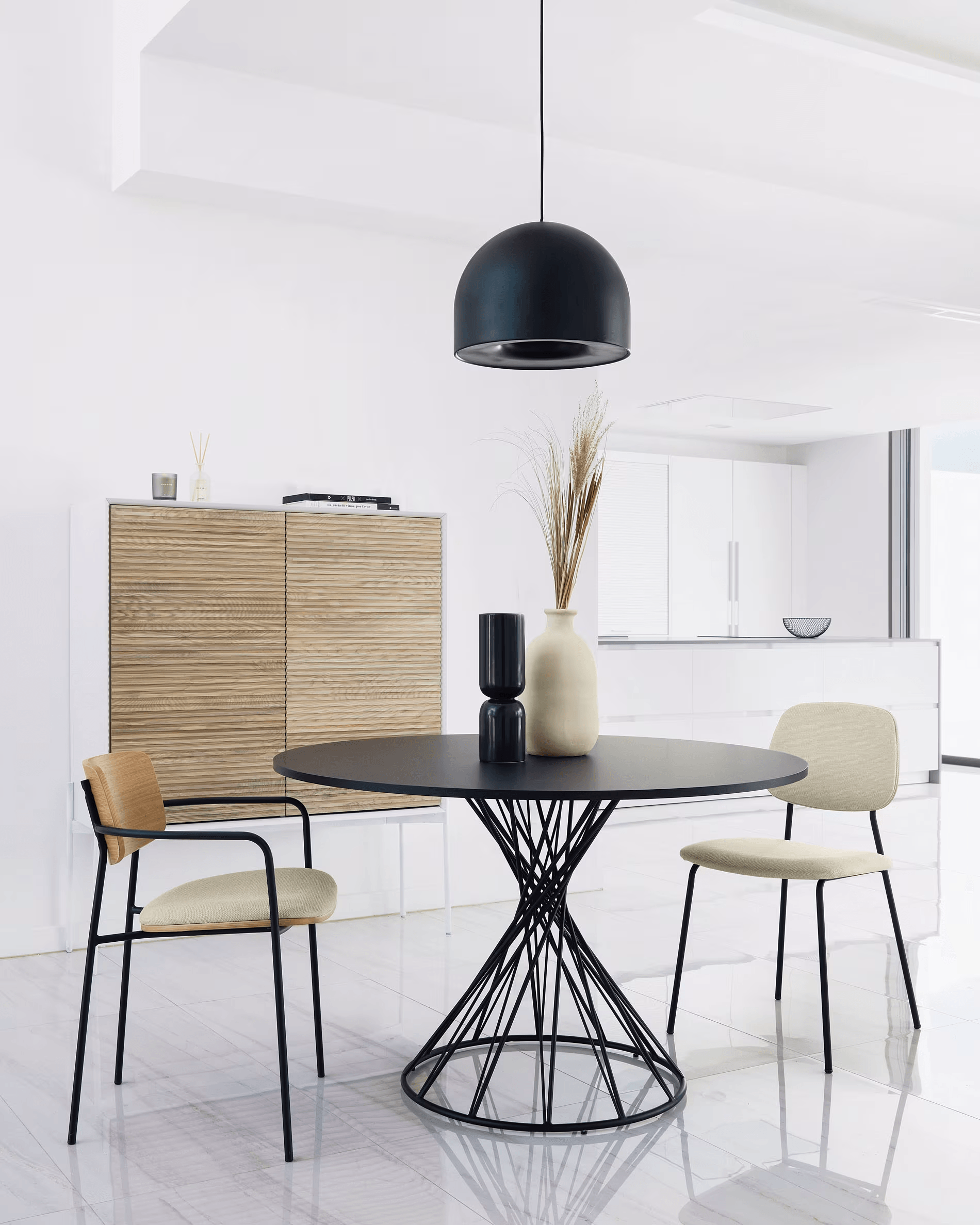 Ronde tafel Niut is een opvallend meubelstuk dat moderne vormen combineert met een artistieke benadering van design. Zijn geometrische silhouet en zwarte blad trekken de aandacht en geven de ruimte een elegante en krachtige uitstraling. De tafel wordt het natuurlijke centrum van de eetkamer, waarbij de moderne stijl van inrichting wordt benadrukt en klassieke patronen worden doorbroken.