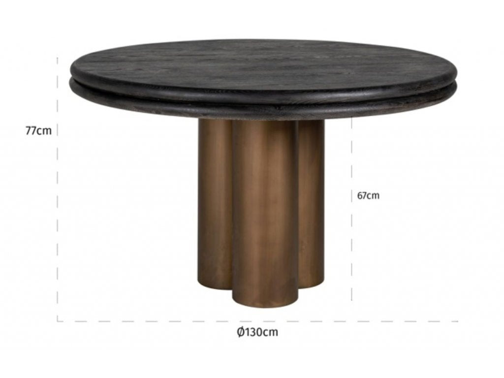 Eettafel rond Macaron in tinten van donkerbruin en messing is een uitstekende keuze voor degenen die waarde hechten aan uniek design en elegantie. Deze luxe tafel is vervaardigd met metaal in de kleur van verouderd messing en een donkerbruine afwerking. Het tafelblad is versierd met prachtig eikenhout, wat een harmonieuze en indrukwekkende compositie creëert.