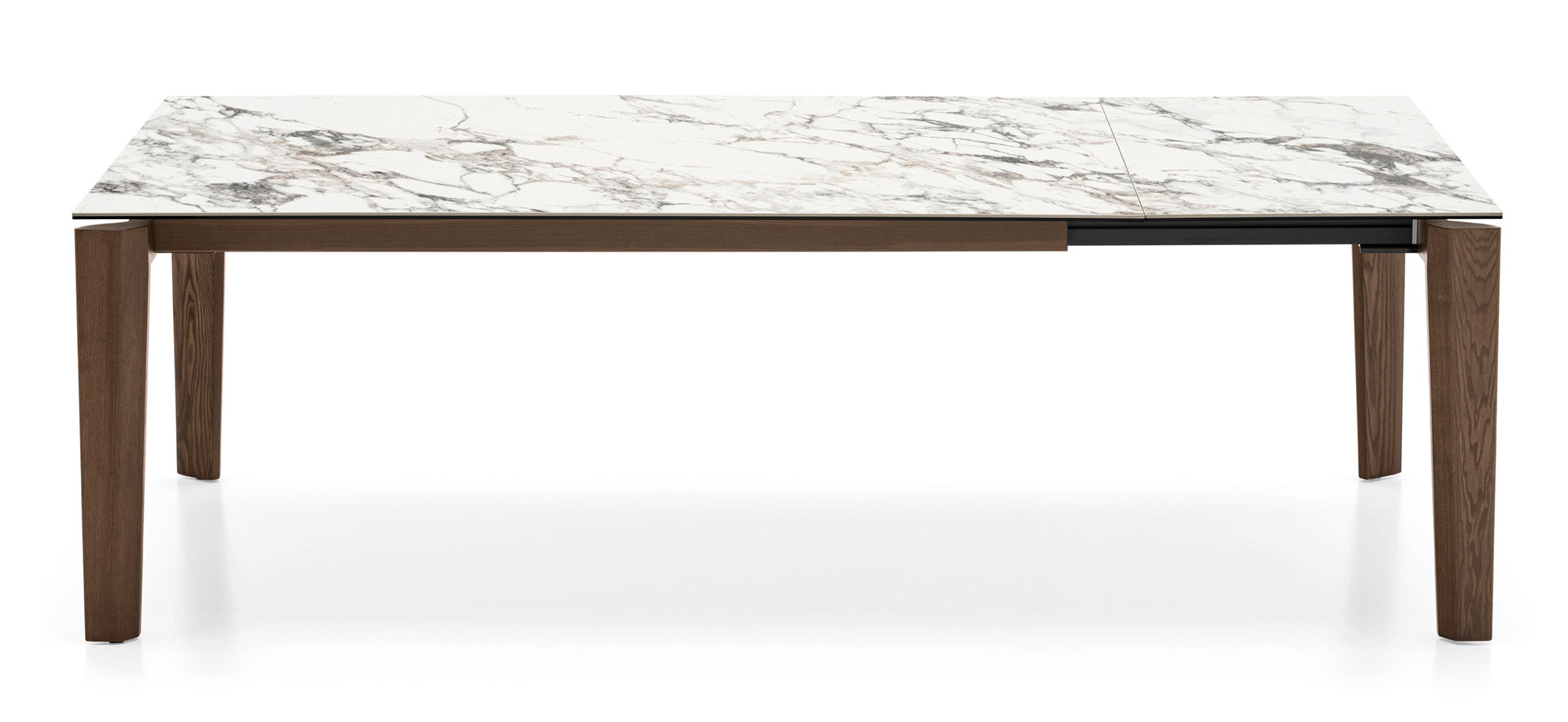 Het blad van de tafel Dogma is uitschuifbaar, en bij het uitschuiven bewegen de poten van de tafel gelijktijdig langs de lengte, wat stabiliteit en comfort biedt. Het uitschuifmechanisme met een ondersteunend openingssysteem vergemakkelijkt het dagelijks gebruik, waardoor de tafel snel kan worden aangepast aan een groter aantal gasten. Dit is de ideale keuze voor ruime eetkamers, waar zowel functionaliteit als tijdloos design belangrijk zijn.