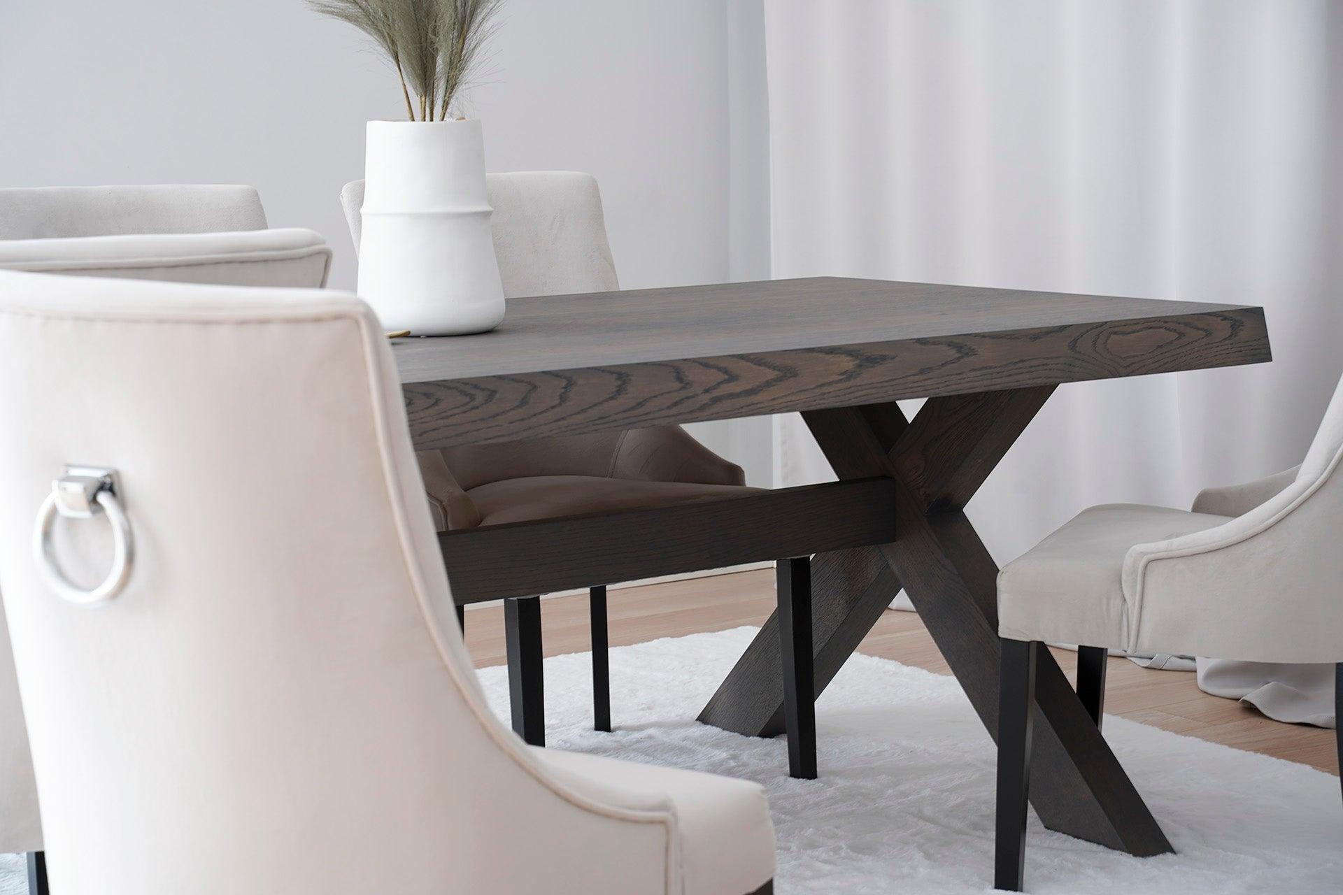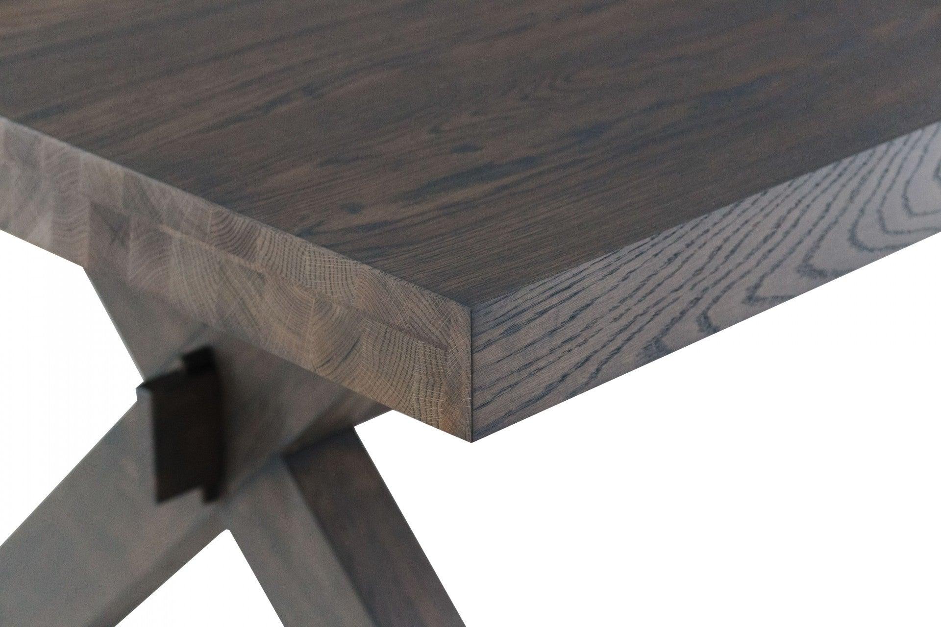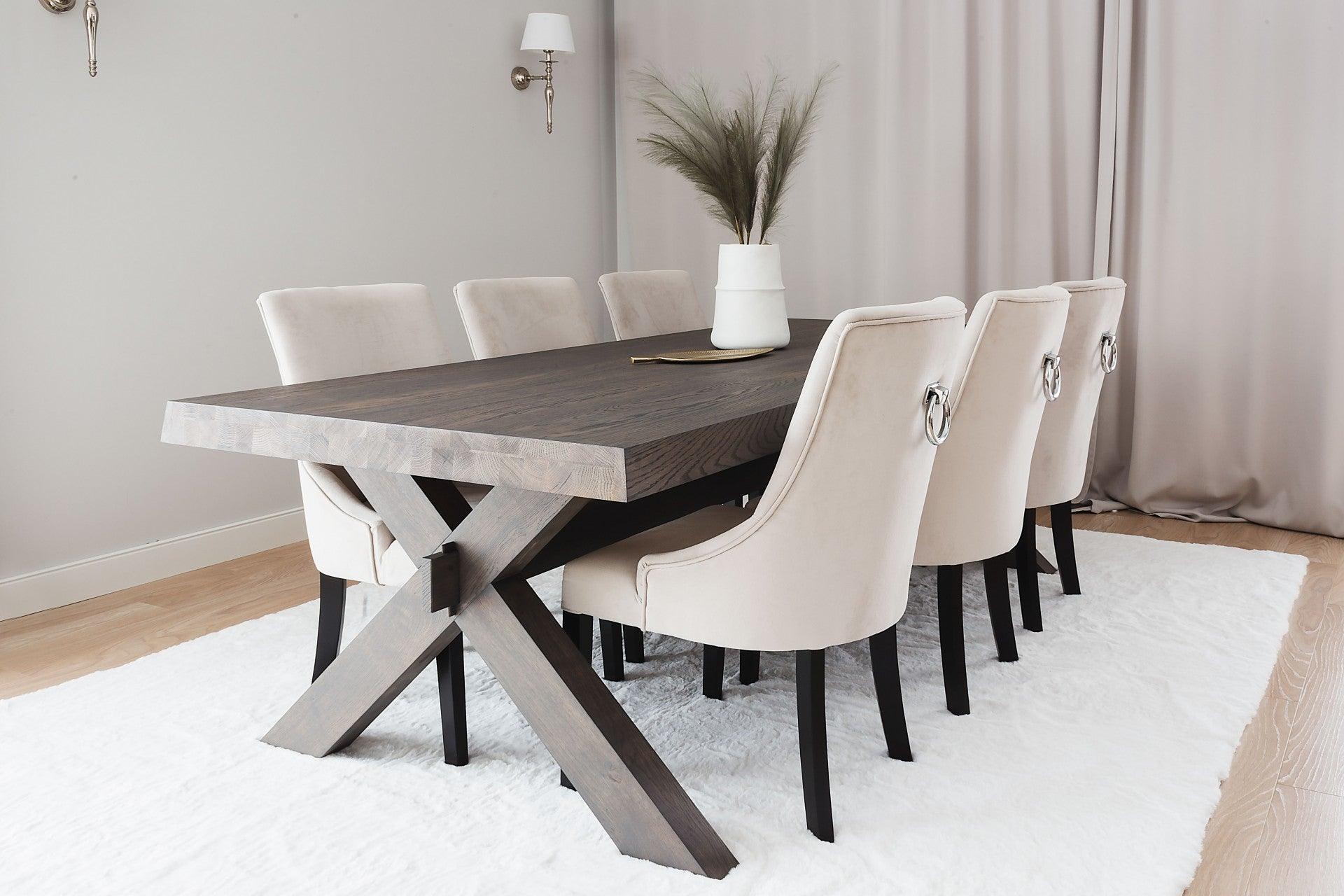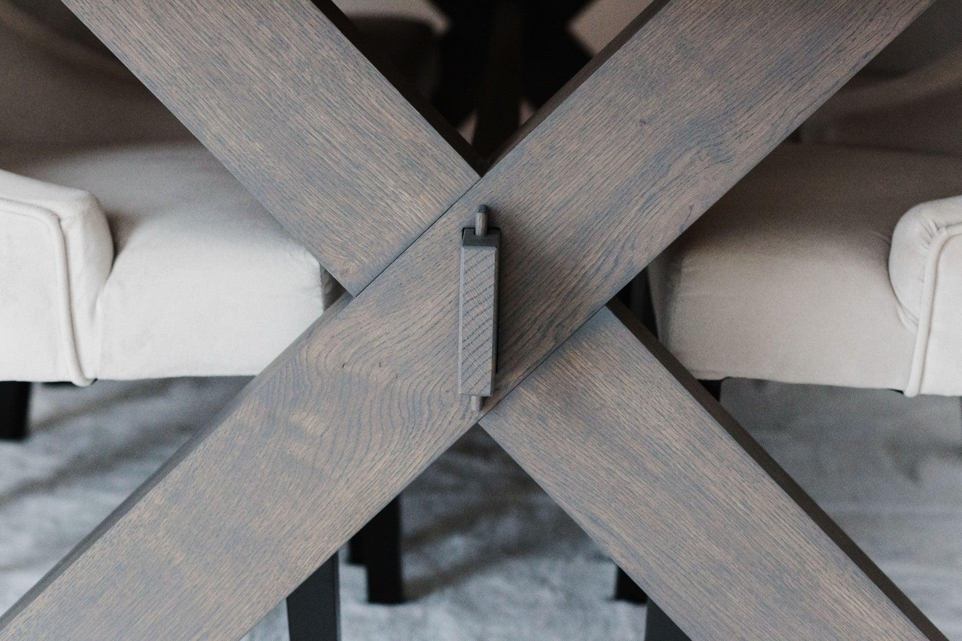 Uittrekbare tafel Farm is ontworpen met het oog op liefhebbers van kruisbenen in tafels. De uniciteit van dit model wordt benadrukt door de verbinding die beide poten met elkaar verbindt via een wigverbinding. De verdikte bladen van 80 mm dik hebben schuin aflopende zijkanten, wat hen elegantie en subtiele lichtheid verleent.