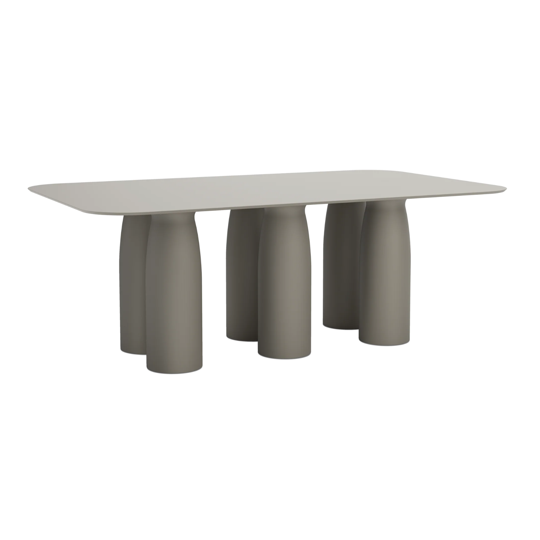 Tafel steunt op zes stabiele poten in de vorm van pilaren, gemaakt van polyethyleen. Hun geometrische vorm geeft het geheel een moderne uitstraling en benadrukt de designexpressie van het meubel. Deze uitzonderlijke tafel is perfect voor een ruime eetkamer, kantoor of restaurant, en creëert een comfortabele plek voor ontmoetingen en werk.
