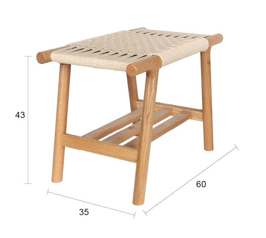 Kruk Kintaro van massief eikenhout is een meubelstuk dat een warme sfeer van de jaren zeventig in uw interieur brengt. Zijn compacte vorm en organische lijnen met afgeronde hoeken geven het een elegante en subtiele uitstraling. Het grootste pluspunt is de zitting van stevig gevlochten touw, waarbij de banden zich in een geometrisch patroon in het midden schikken. Extra latten onder de zitting creëren een praktische ruimte, perfect voor boeken, schoenen of andere spulletjes.