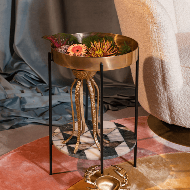 Another Marble is een speelse knipoog naar marmeren tafels, die de interieurmarkt de laatste tijd hebben overspoeld. Dit ontwerp biedt echter een frisse kijk op de klassieke bijzettafel. Het combineert vakkundig geborsteld messing met donkergrijs, rokerig marmer, en steunt op minimalistische, ijzeren poten.