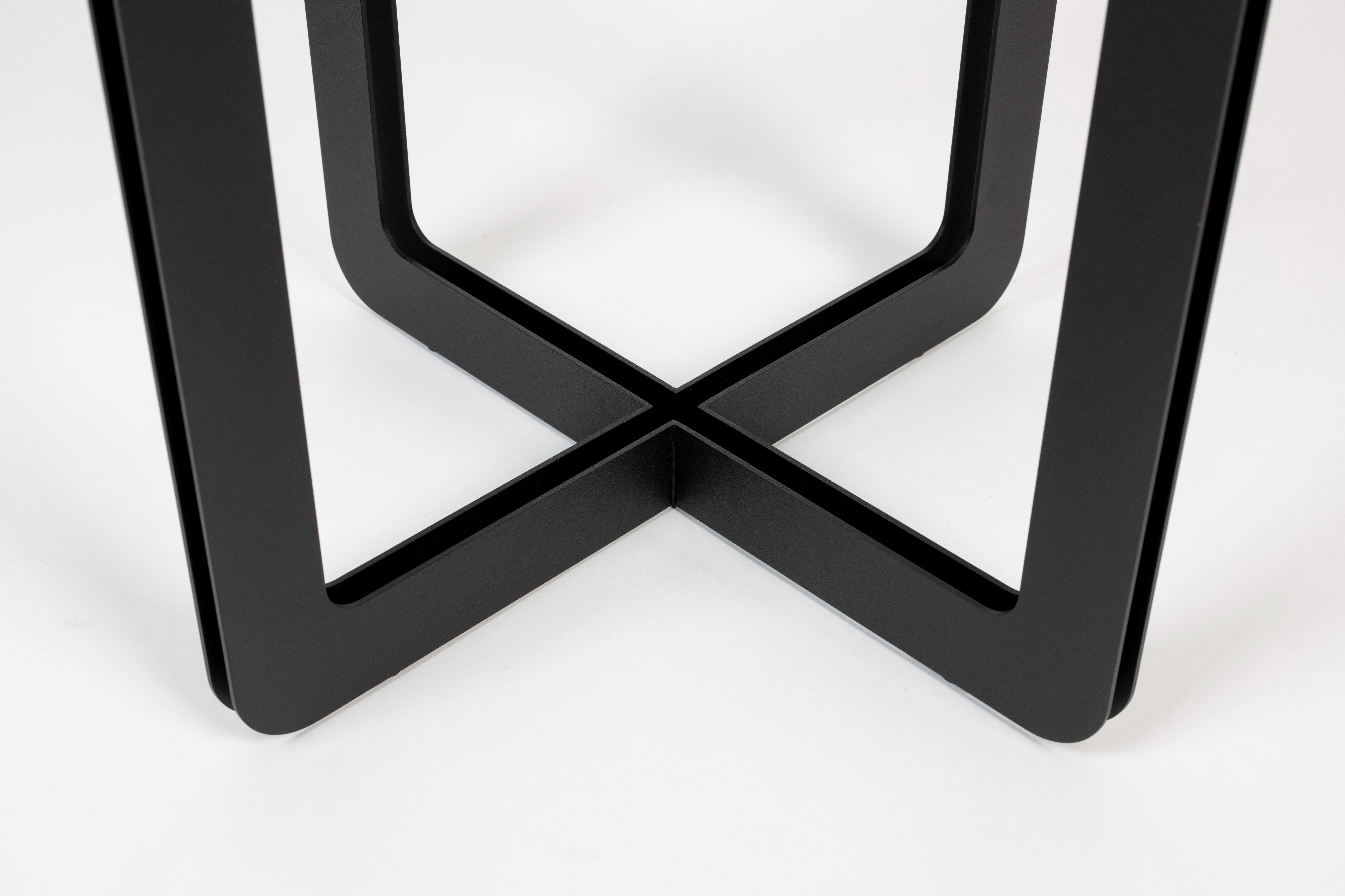 Stoliki ontworpen door Bas Vellekoop is een voorbeeld van verfijnd design, waarin elk detail telt. De kenmerkende, dubbel gekruiste basis en het gelakte blad, perfect geïntegreerd in het matte, metalen frame, vormen een samenhangend, modern geheel. Een extraatje is het subtiele logo van de ontwerper, dat in de basis is geplaatst.