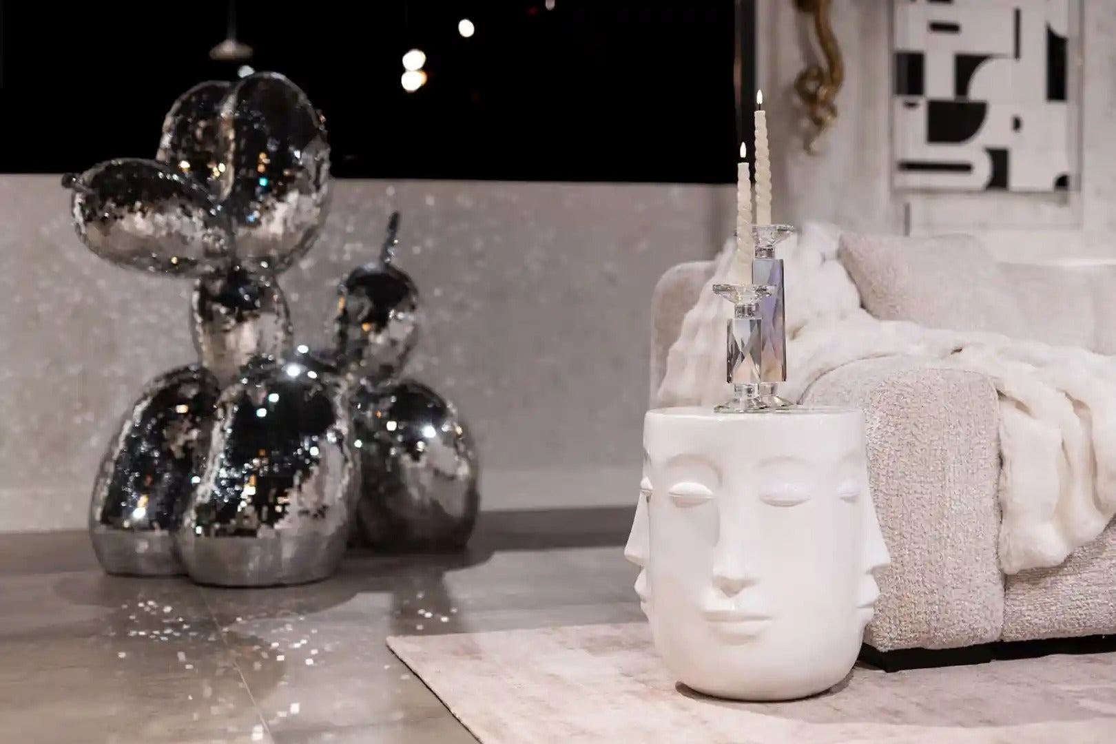 Moderne tafel Christy in de vorm van een sculptuur met een gezicht is een uniek decoratief element dat functionaliteit verbindt met artistiek design. Zijn minimalistische vorm en glanzende witte afwerking zorgen ervoor dat hij perfect past in zowel moderne als eclectische inrichtingen. Hij kan dienen als bijzettafel, nachttafeltje of decoratief stuk, maar ook als originele sokkel voor planten of versieringen.