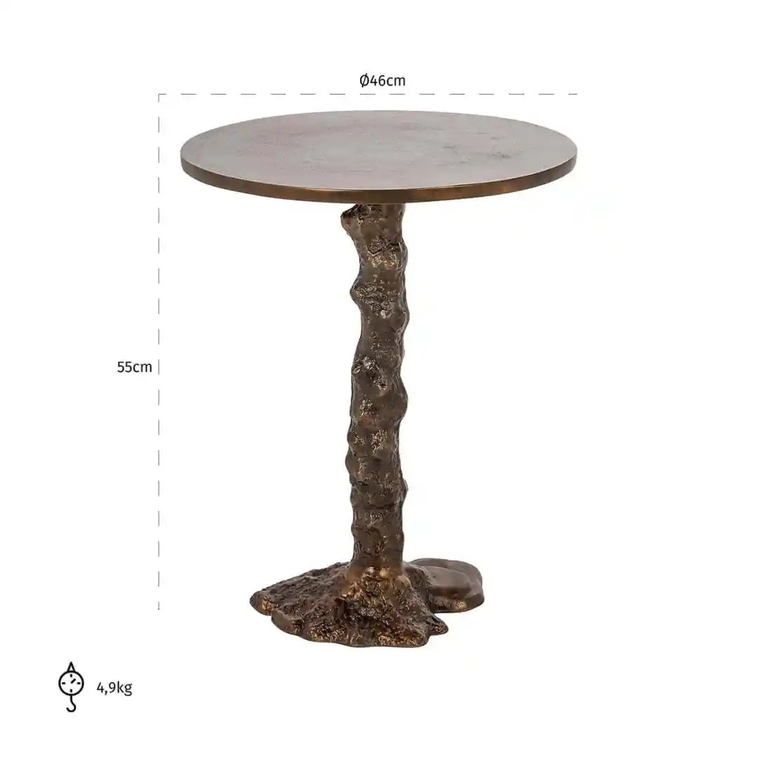 Elegante bijzettafel Misty met een unieke basis geïnspireerd op de natuurlijke vorm van een boom is een bijzondere decoratieve accent voor elk interieur. De handmatig afgewerkte structuur geeft het een artistiek karakter, en het geheel is uitgevoerd in een warme, metallic tint die prachtig samengaat met moderne, industriële of eclectische inrichtingen.