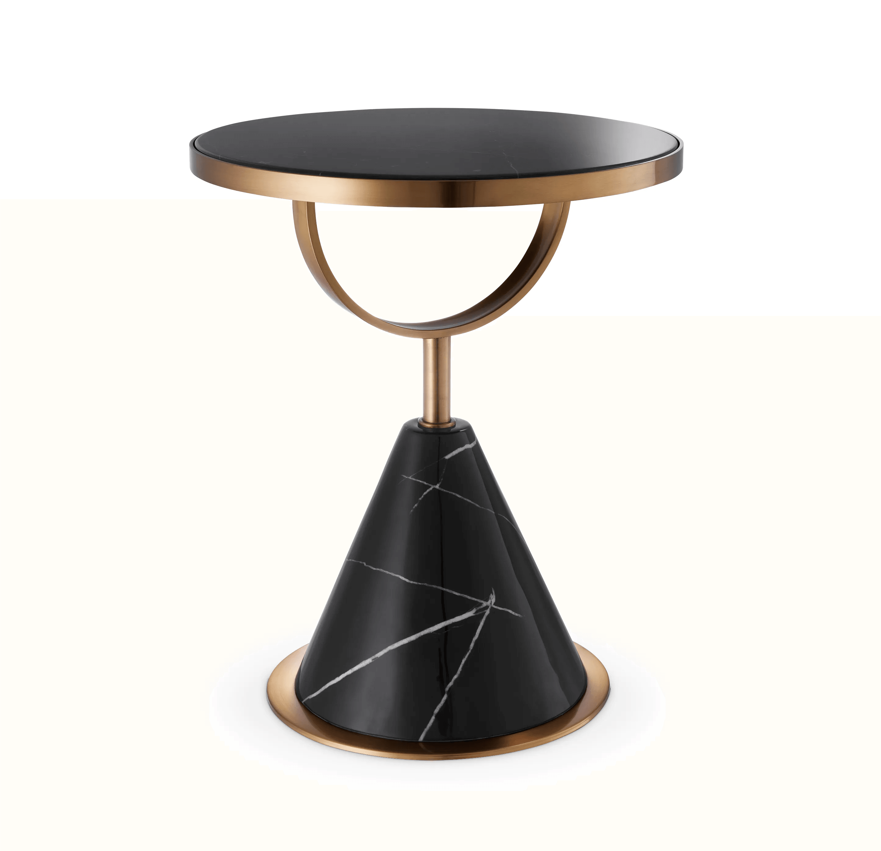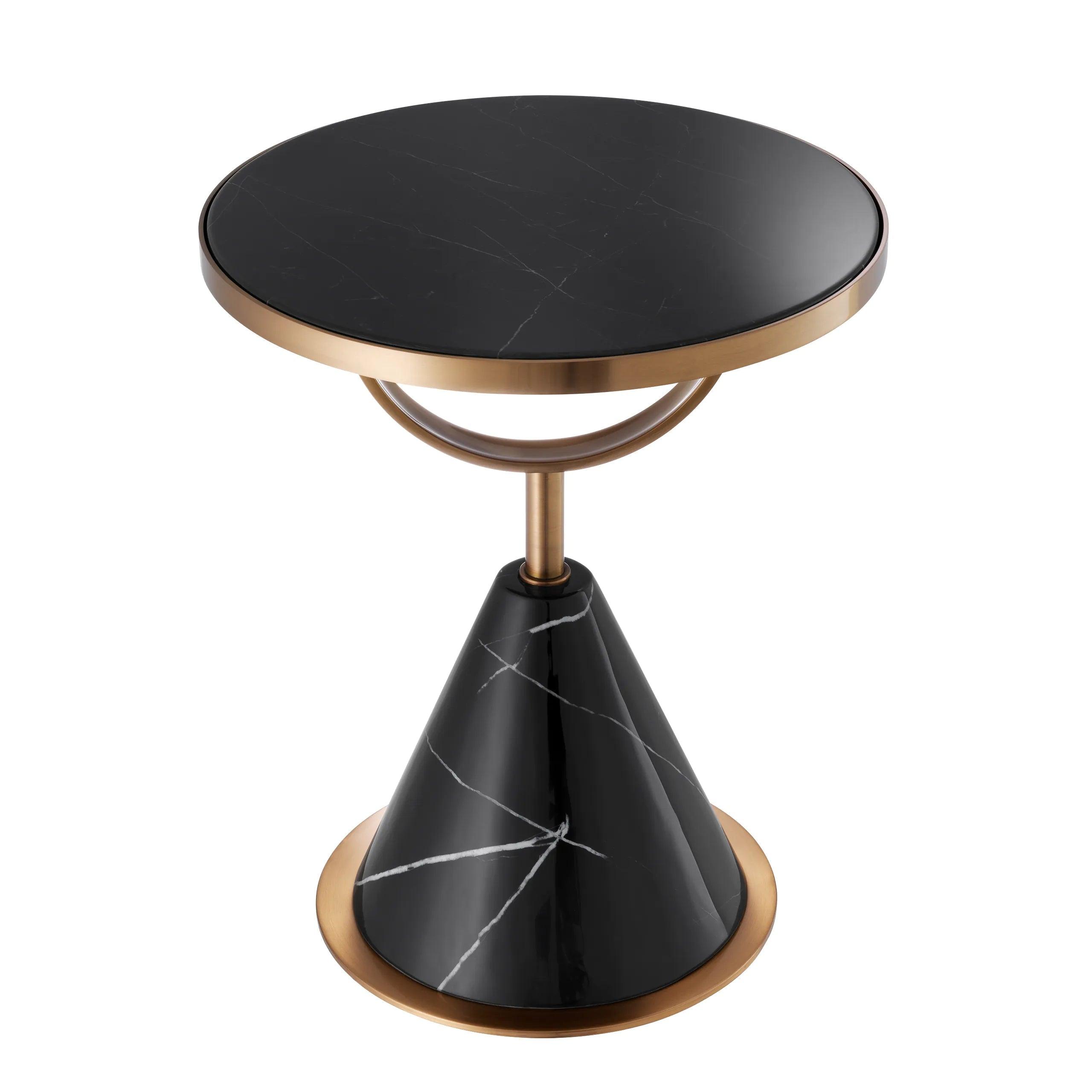 Het blad, uitgevoerd in een imitatie van zwart marmer, zorgt niet alleen voor een gladde en glanzende oppervlakte, maar voegt ook een diepe, marmeren esthetiek toe die al eeuwenlang synoniem staat voor luxe. De conische basis geeft het ontwerp een eigentijdse lichtheid, zonder in te boeten op stabiliteit. Bovendien geeft de zwarte afwerking het meubel een warme, metallic glans die een vleugje nobelheid en verfijning toevoegt. Het harmoniseert perfect met het donkere marmer, waardoor een evenwichtige en samenhangende compositie ontstaat.