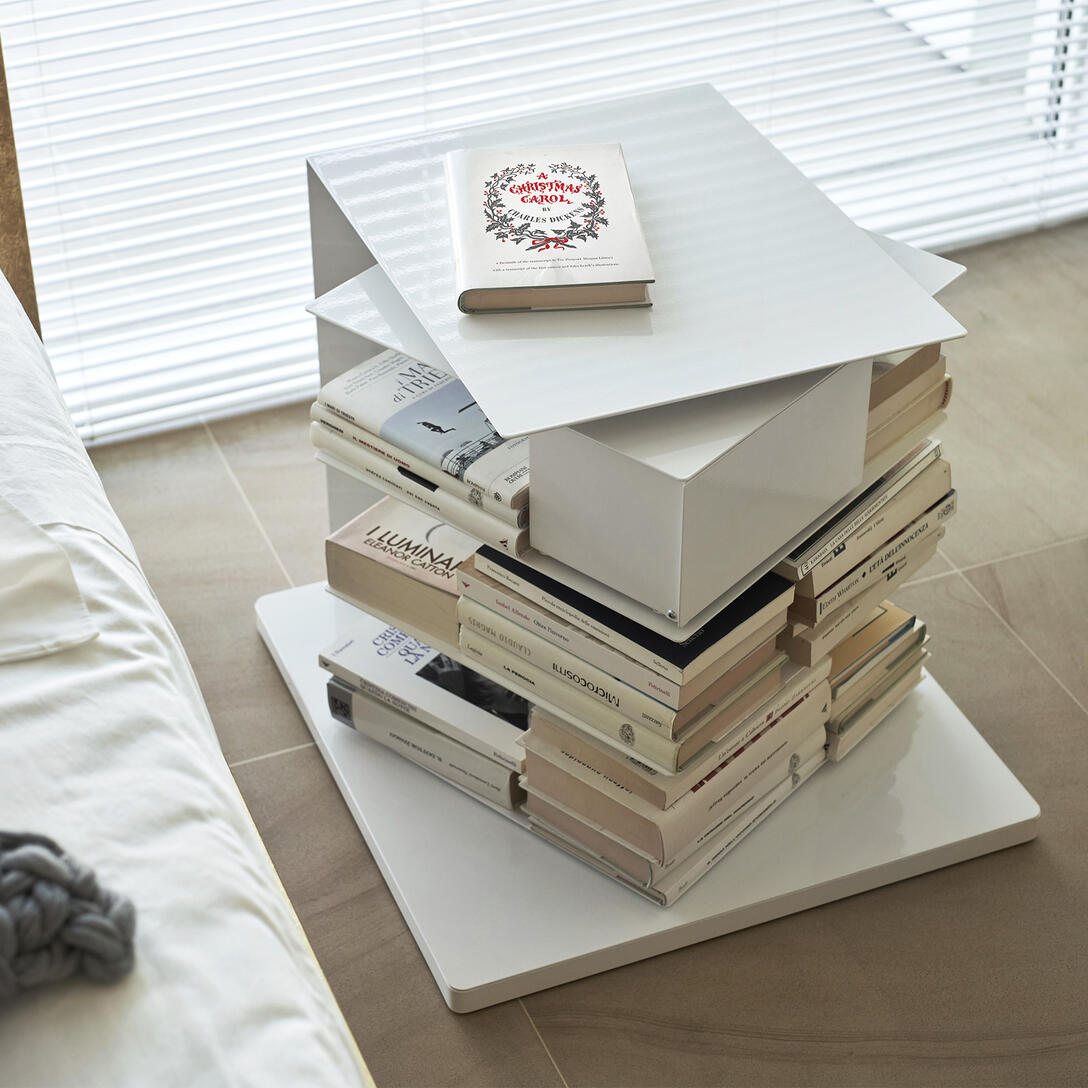 Stolik Ptolomeo x 4 is een uiterst praktische meubelstuk dat de functies van een bijzettafel, nachtkastje en moderne boekenplank combineert. Voorzien van drie 360° draaibare planken en een afsluitbaar opbergvak voor kleine spulletjes, is het zowel geschikt voor naast het bed als in de woonkamer of kantoorruimte. De vaste basis en het blad zorgen voor stabiliteit, terwijl de verstelbare poten een perfecte aanpassing aan elk oppervlak mogelijk maken.