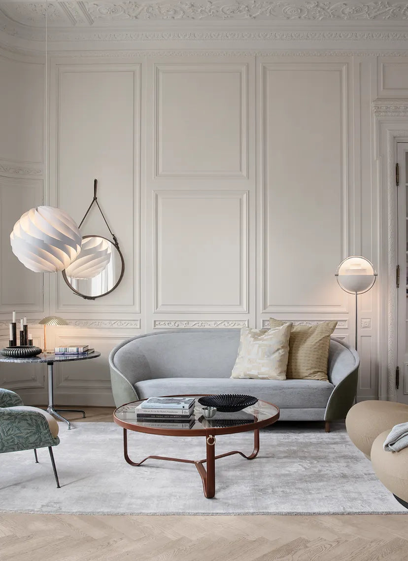 De salontafel Adnet is een icoon van de Franse moderniteit, ontworpen in de jaren '50 van de 20e eeuw door Jacques Adnet – een visionair die moedig functionaliteit met luxe combineerde. Zijn ontwerp valt op door de handgemaakte leren rand die de glazen tafelblad omringt, evenals de drie messing ringen die een decoratief accent toevoegen. Subtiel gebogen metalen poten die centraal onder het blad samenkomen, geven deze klassieke vorm een gevoel van lichtheid en een unieke uitstraling.