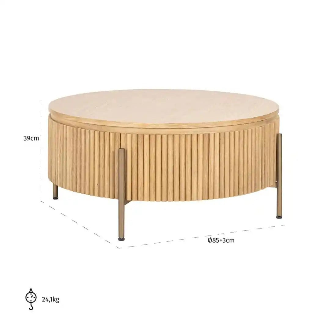 Elegante salontafel Belfort in ronde vorm is een harmonieuze combinatie van natuurlijke materialen en modern design. De geprofileerde omhulsel in een lichte houttint geeft het meubel een luchtige uitstraling, terwijl het tegelijkertijd de aandacht trekt met zijn decoratieve afwerking. De metalen poten in de kleur van gebroken koper voegen stabiliteit en een nobele accent toe aan de constructie.