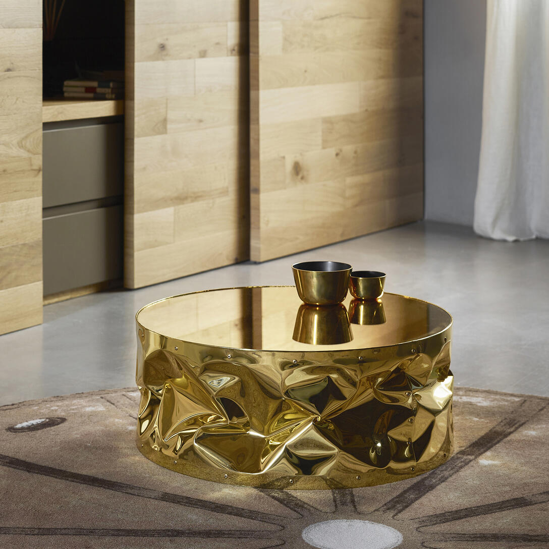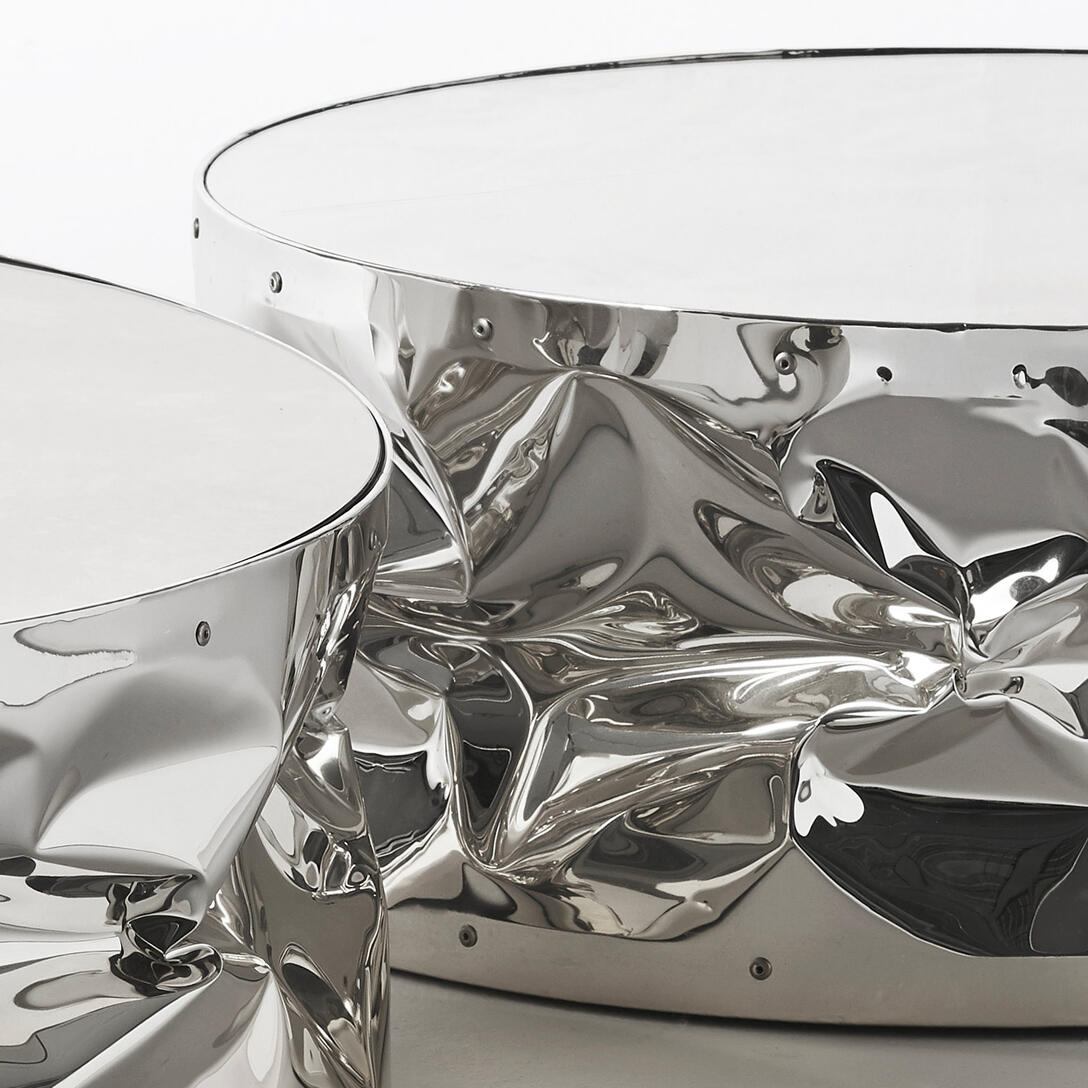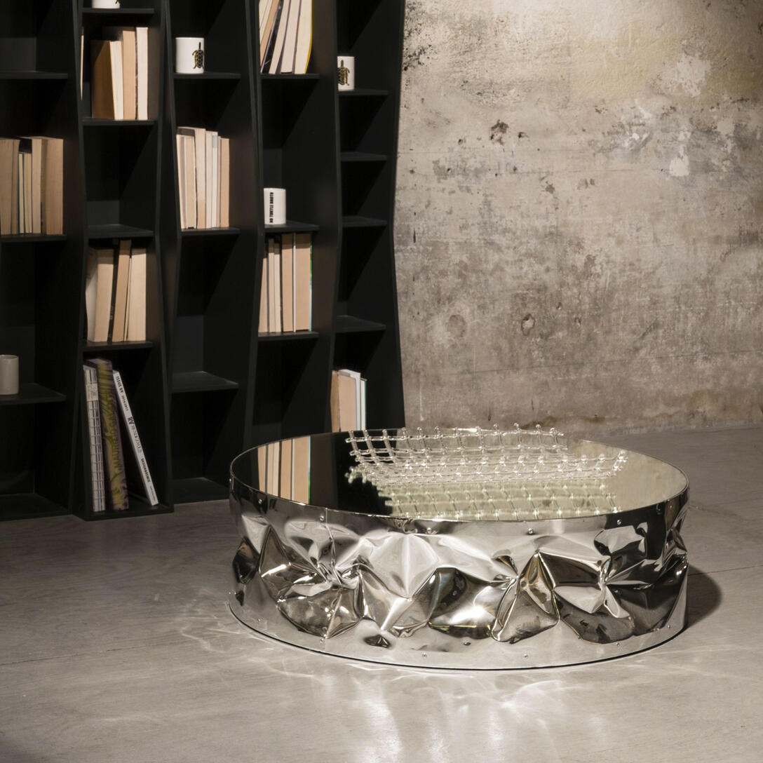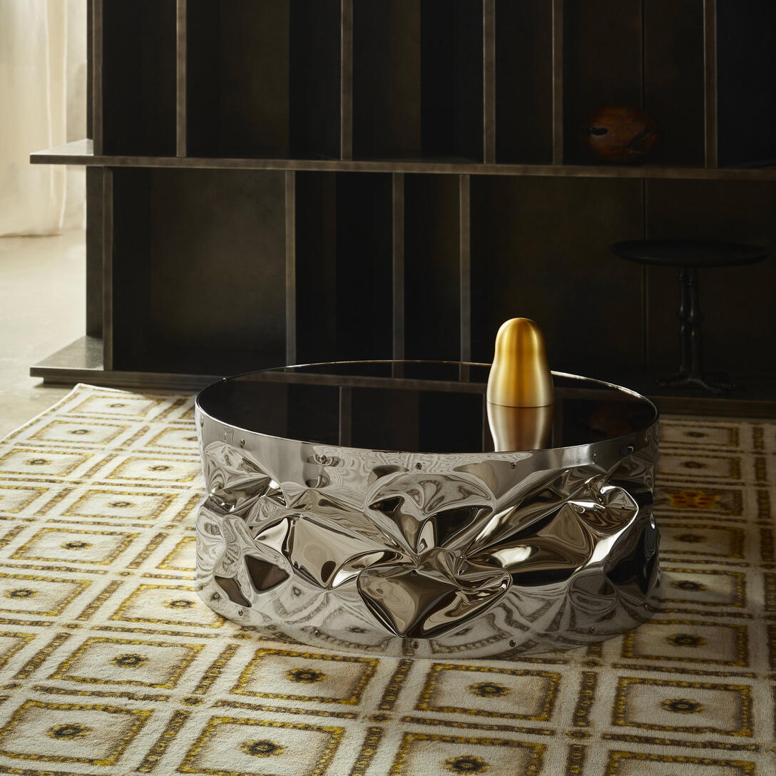 Tab.Ulone naar opvallende salontafel op wielen, ontworpen door Bruno Rainaldi, die ruwe vormen combineert met verfijnde afwerking. De kenmerkende, handmatig gekreukte aluminium oppervlakte in combinatie met het spiegelende blad creëert een unieke lichtreflectie die de aandacht trekt en elegantie toevoegt aan elk interieur. Het is perfect voor zowel een moderne woonkamer als een klassiek interieur, waar het een subtiele, maar opvallende accent zal zijn.