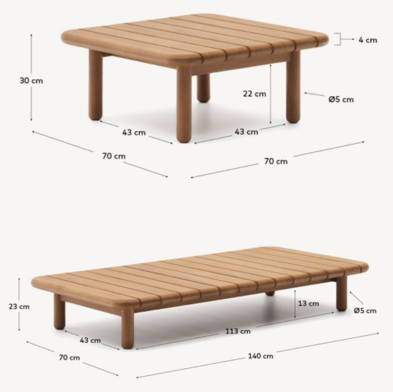 De collectie Turqueta is vervaardigd uit massief teakhout, wat niet alleen een elegante uitstraling geeft, maar ook ongeëvenaarde sterkte en duurzaamheid biedt. Teakhout wordt gewaardeerd om zijn weerbestendigheid en de subtiele tinten die elke meubelstuk charme geven. Hierdoor is de koffietafel Turqueta perfect voor gebruik op het terras, in de tuin of in vochtige ruimtes, zonder zorgen over zijn staat of uiterlijk.