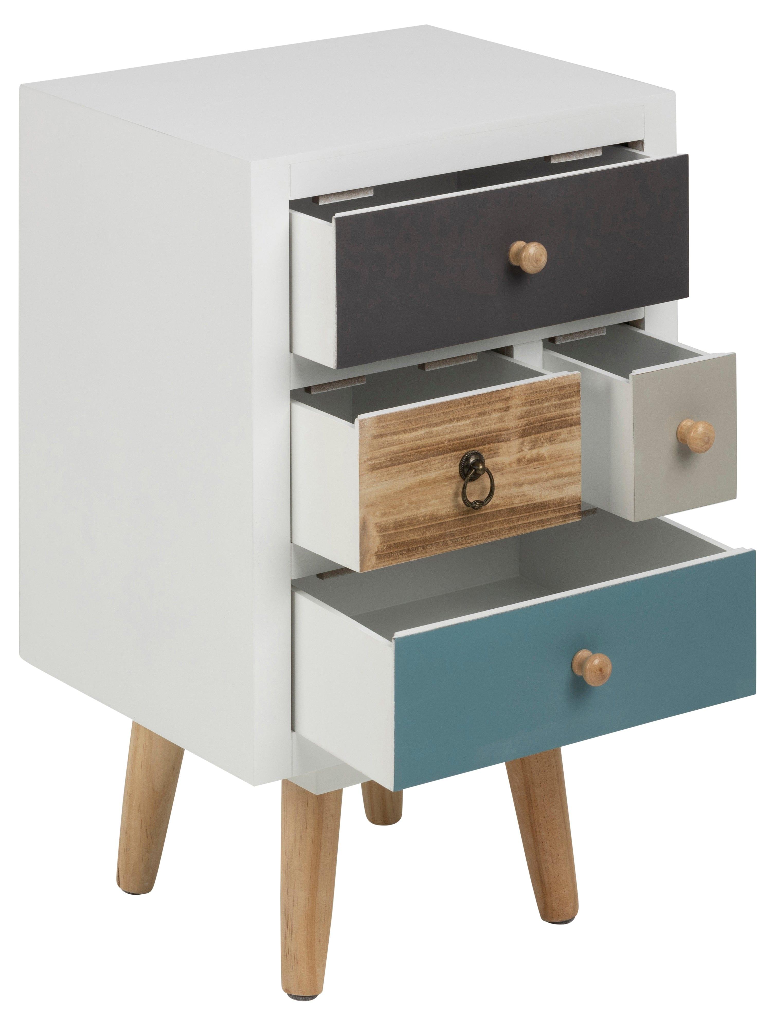 Nachtkastje Thais in de kleur wit is een excentrieke keuze die zelfs de meest veeleisende klant zal aanspreken. De kleurrijke lades voegen charme toe aan het hele ontwerp en zorgen voor een unieke uitstraling. Met vier lades biedt het nacht kastje Thais voldoende ruimte voor al uw belangrijkste spullen.