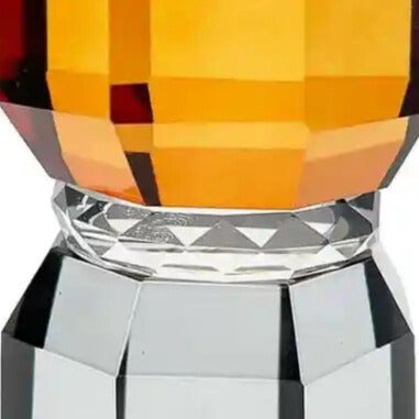Designerska kaarsenhouder Thyra van glas is een elegante toevoeging die moderne vormgeving combineert met een unieke uitstraling. De combinatie van een amberkleurige bovenkant met een transparante basis creëert een opvallend contrast, waardoor de kaarsenhouder een origineel decoratief accent wordt. Het geometrische, facetterende oppervlak weerkaatst prachtig het licht en benadrukt de luxe uitstraling van het object.