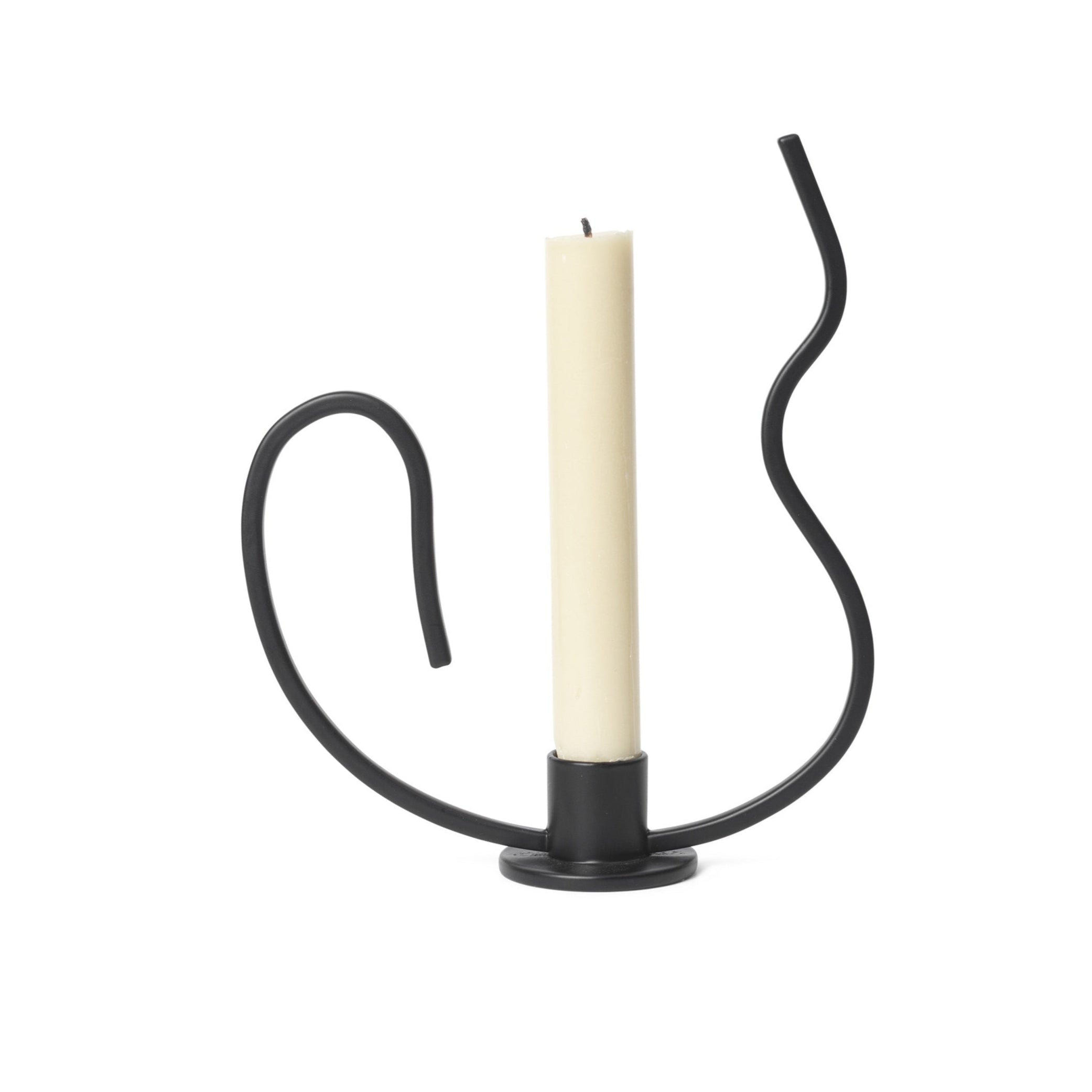 Kaarsenhouder Valse in zwarte kleur betovert met zijn vloeiende, golvende vorm, die de beweging vastgelegd in een dans doet herinneren. Geïnspireerd door de elegante bewegingen van de wals, is de kaarsenhouder gemaakt van poedergecoat ijzer, wat hem een moderne en tegelijkertijd tijdloze uitstraling geeft.