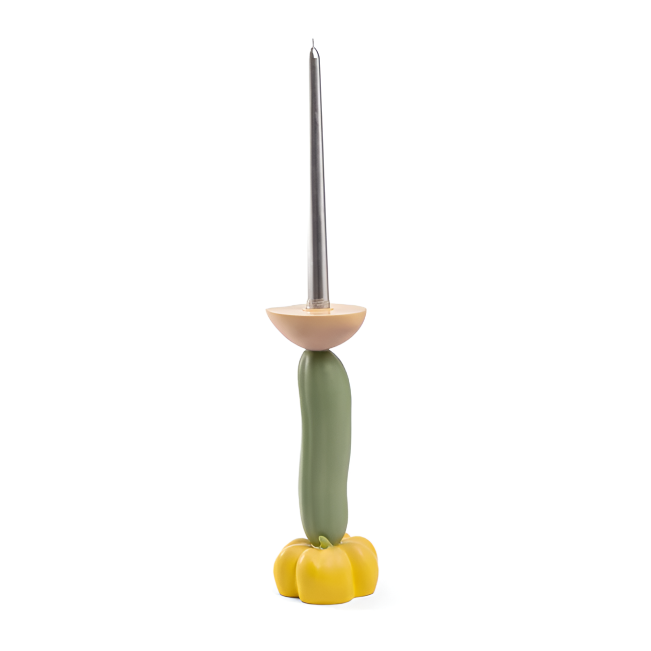 De constructie van de kaarsenhouder verwijst naar organische vormen – de basis in de vorm van een paprika ondersteunt de verlengde komkommer, bekroond met een subtiele schaal voor de kaars. Levendige kleuren en zachte lijnen geven het een artistiek karakter, waardoor het een perfecte accent is voor interieurs met een vleugje extravagant.