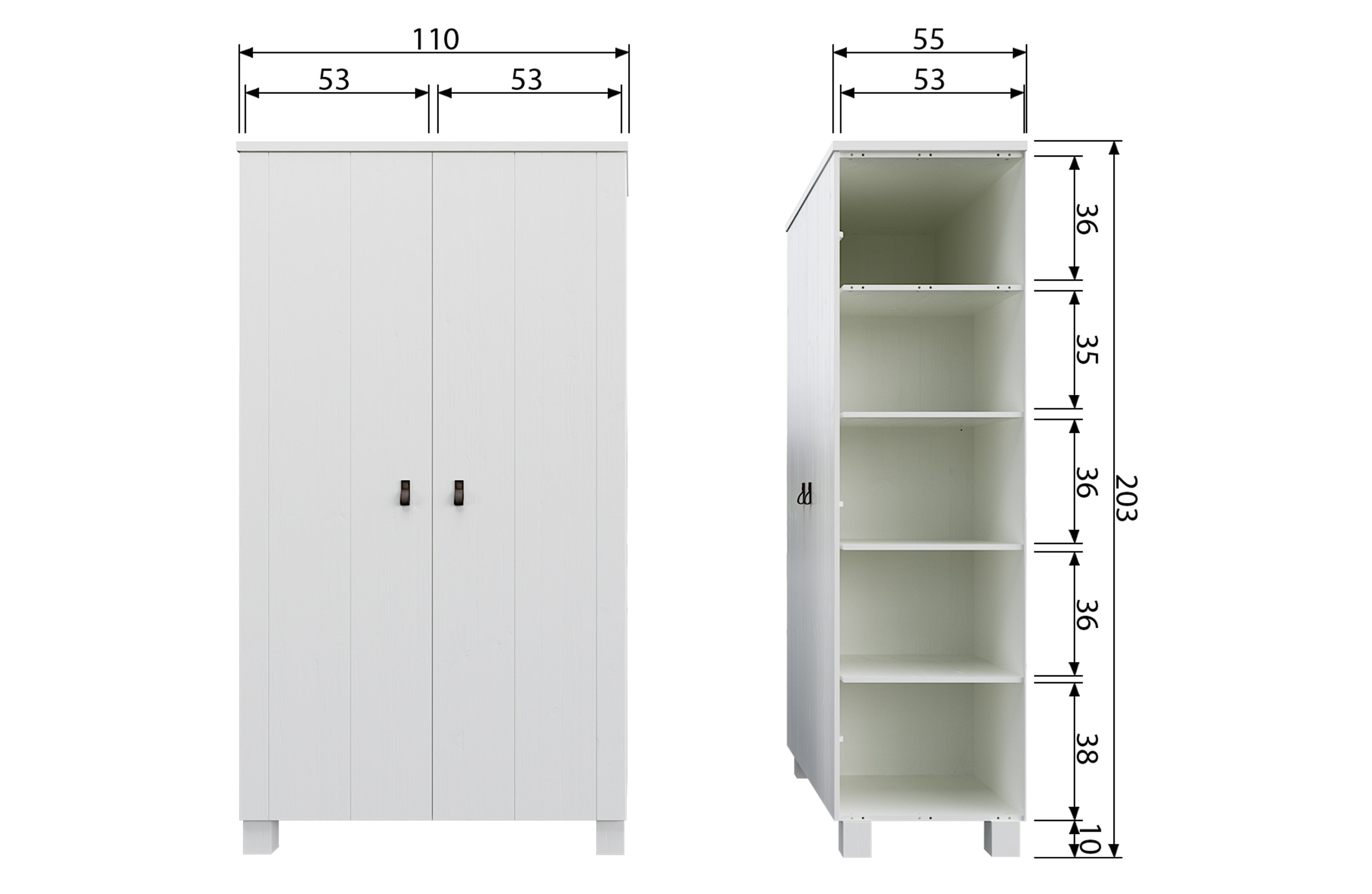 Witte kast Ties is gemaakt van vurenhout, wat zorgt voor duurzaamheid en een lange levensduur. De twee deuren openen moeiteloos en onthullen een opbergruimte die groot genoeg is om alles op te bergen wat u nodig heeft - van kleding tot beddengoed of handdoeken.