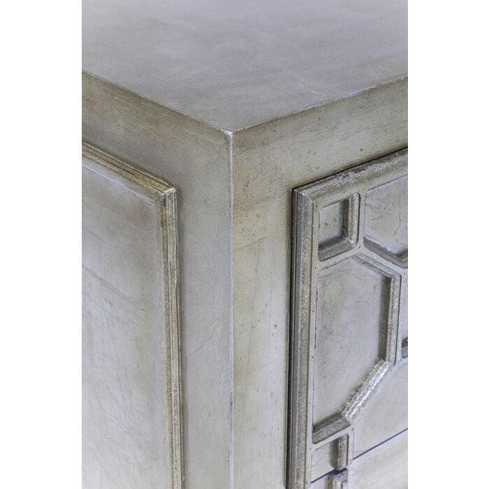De Alhambra kast is een eerbetoon aan de ornamentiek en details geïnspireerd door de Arabische kunst. De voorkant valt op door de verfijnde patronen, benadrukt door een exclusieve, matte afwerking in zilveren kleur, wat haar elegantie en luxe uitstraling geeft die perfect past bij de glamourstijl.