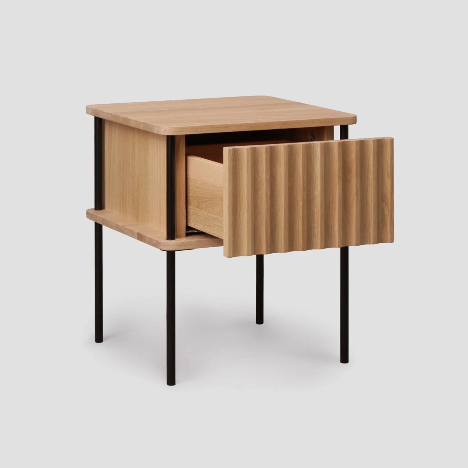 Nachtkastje Maya is een harmonieuze combinatie van sculpturale vorm en dagelijkse functionaliteit. De uitgesproken front met verticale frezing geeft het meubel een unieke uitstraling, terwijl het contrast tussen het natuurlijke hout en de stalen poten in zwart de moderne esthetiek benadrukt.