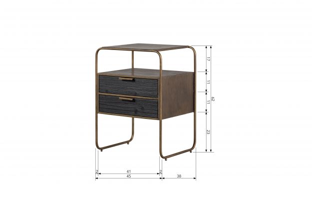 De metalen constructie met een afwerking in antiek messing geeft het meubel een nobele uitstraling en een vleugje vintage. Twee ondiepe lades van zwartgekleurd hout, met een duidelijk zichtbare nerf, voegen een ruwe charme toe en benadrukken de uitzonderlijke afwerking.