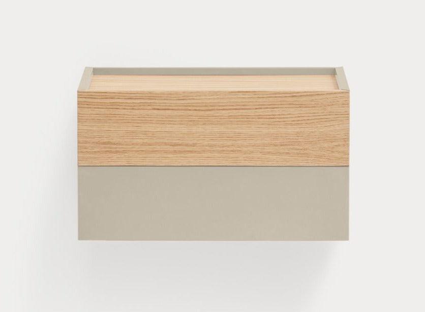 Hangende nachtkastje Otto in beige valt op door zijn moderne stijl met strakke lijnen, waarbij de kleur harmonieus samengaat met accenten van natuurlijk fineer, wat het mogelijk maakt om het in verschillende ruimtes te integreren. U kunt het aan de muur hangen, waardoor het lijkt alsof het zweeft, wat een bijzonder visueel effect toevoegt.