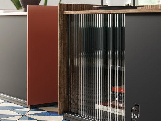 Met de mogelijkheid om steunen toe te voegen of te verwijderen en verschillende accessoires en details te combineren, zoals glas, metaal, hout en kleurvarianten, de grijze kast Pixi wordt een adaptief meubel dat zich aanpast aan uw behoeften en verbeelding.