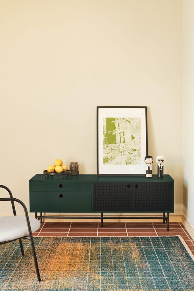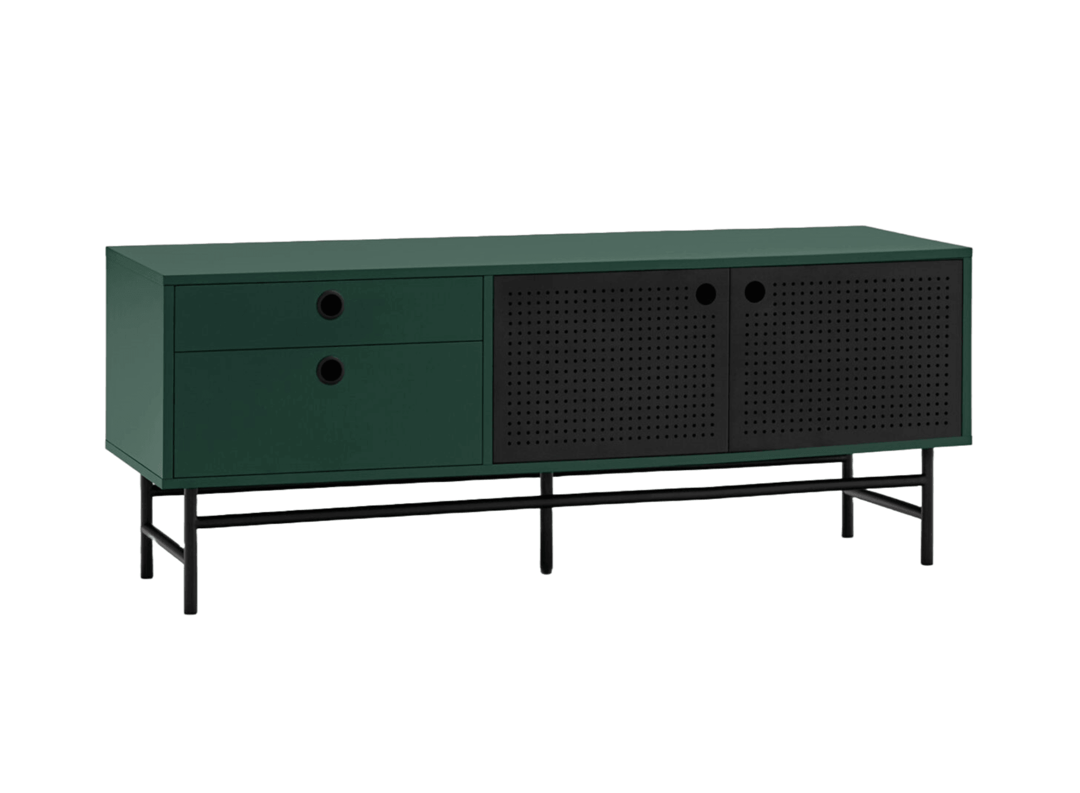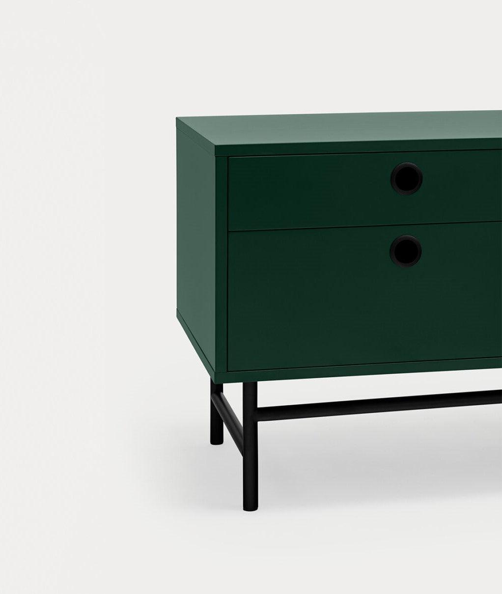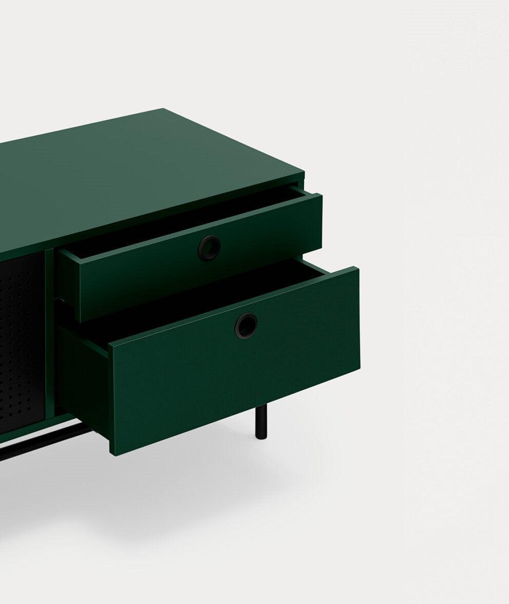 Kleine RTV-kast Punto in een diepe donkergroene tint is de essentie van de Punto-collectie, die zich kenmerkt door een industriële stijl gecombineerd met functionaliteit. Het unieke karakter en de persoonlijkheid van het meubel worden benadrukt door de kenmerkende geperforeerde metalen deuren. Met twee lades en een paar deurtjes die vier planken verbergen,