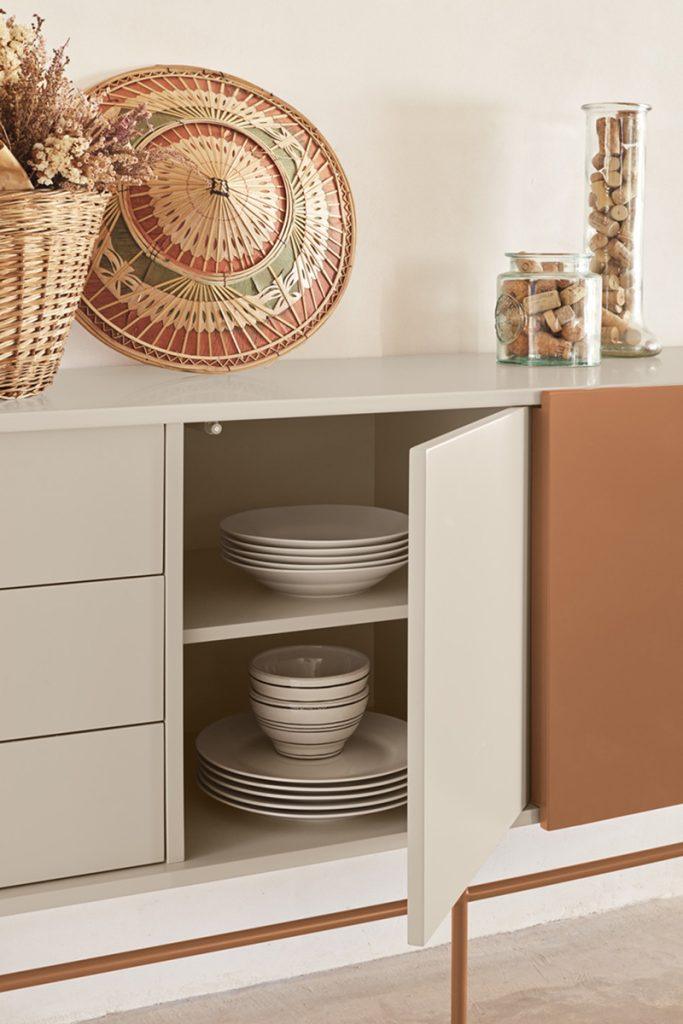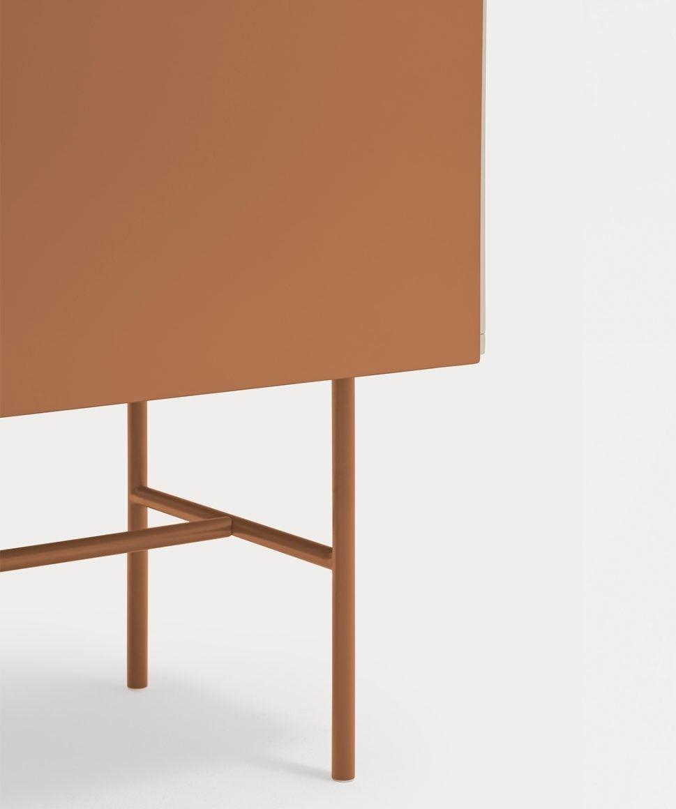 De brede kast in een unieke kaneel-beige kleur. De Nube-collectie valt op door de bijzondere en uitgesproken configuratie dankzij de schuifdeuren, die naar wens kunnen worden ingesteld, aangepast aan persoonlijke voorkeuren. De manier waarop deze deuren over de brede kast Nube schuiven, waarbij verschillende delen van het interieur worden onthuld en verborgen, is geïnspireerd op de manier waarop wolken over de lucht bewegen.